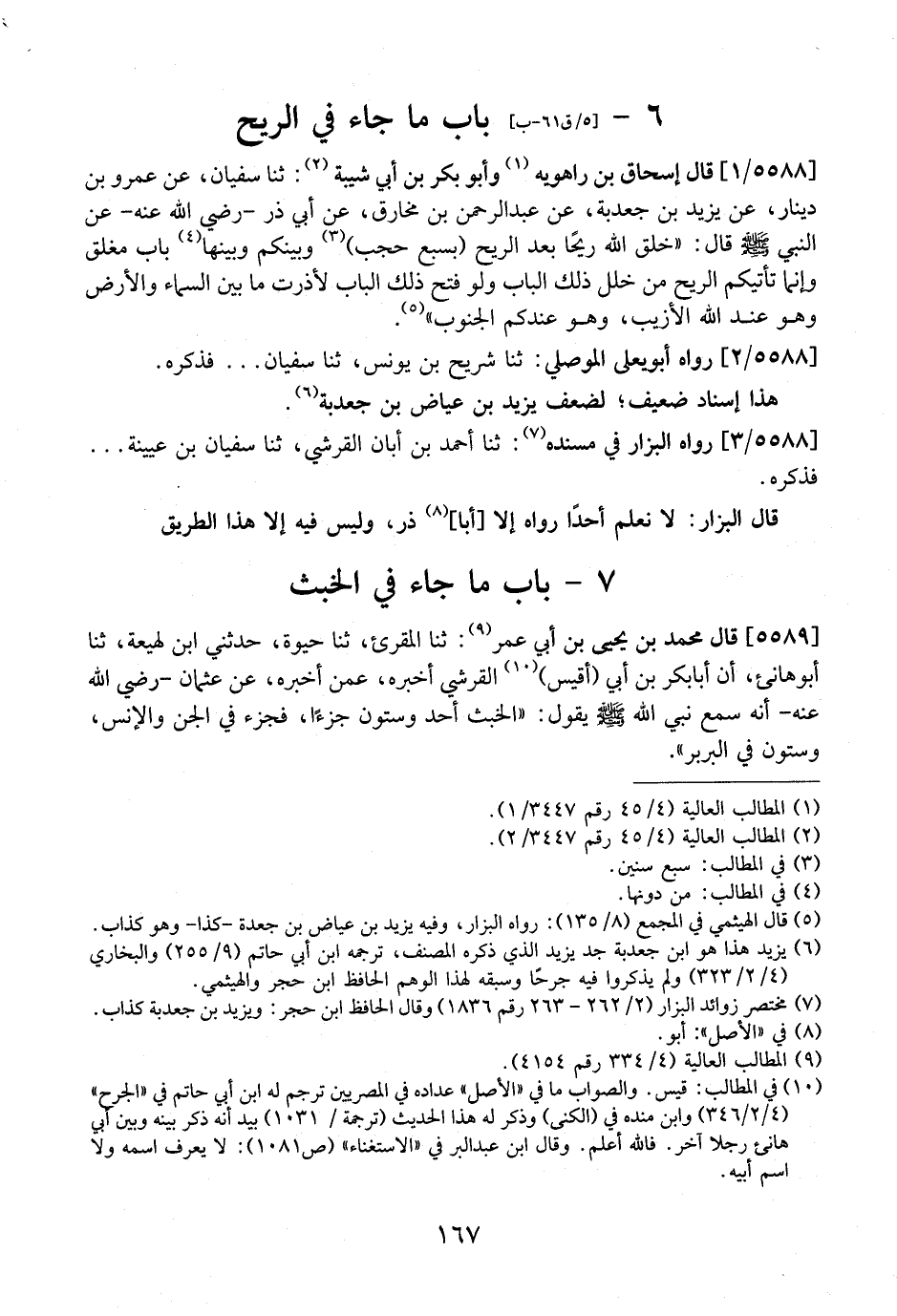5588 / 1 - قَالَ إِسْحَاقُ بْنُ رَاهَوَيْهِ وَأَبُو بَكْرِ بْنُ أَبِي شَيْبَةَ: ثَنَا سُفْيَانَ، عَنْ عَمْرِو بْنِ دِينَارٍ، عَنِ يَزِيدَ بْنِ جَعْدَبَةَ، عَنْ عَبْدِ الرَّحْمَنِ بْنِ مُخَارِقٍ، عَنْ أَبِي ذَرٍّ- رَضِيَ اللَّهُ عَنْهُ- عَنِ النَّبِيِّ - صَلَّى اللَّهُ عَلَيْهِ وَسَلَّمَ - قَالَ: "خَلَقَ اللَّهُ رِيحًا بَعْدَ الرِّيحِ بِسَبْعِ حُجُبٍ وَبَيْنَكُمْ وَبَيْنَهَا بَابٌ مُغْلَقٌ وَإِنَّمَا تَأْتِيكُمُ الرِّيحُ من خلل ذلك الباب ولو فتح ذلك الباب لأذرت مَا بَيْنَ السَّمَاءِ وَالْأَرْضِ وَهُوَ عِنْدَ اللَّهِ الأزيب، وَهُوَ عِنْدَكُمُ الْجَنُوبُ".