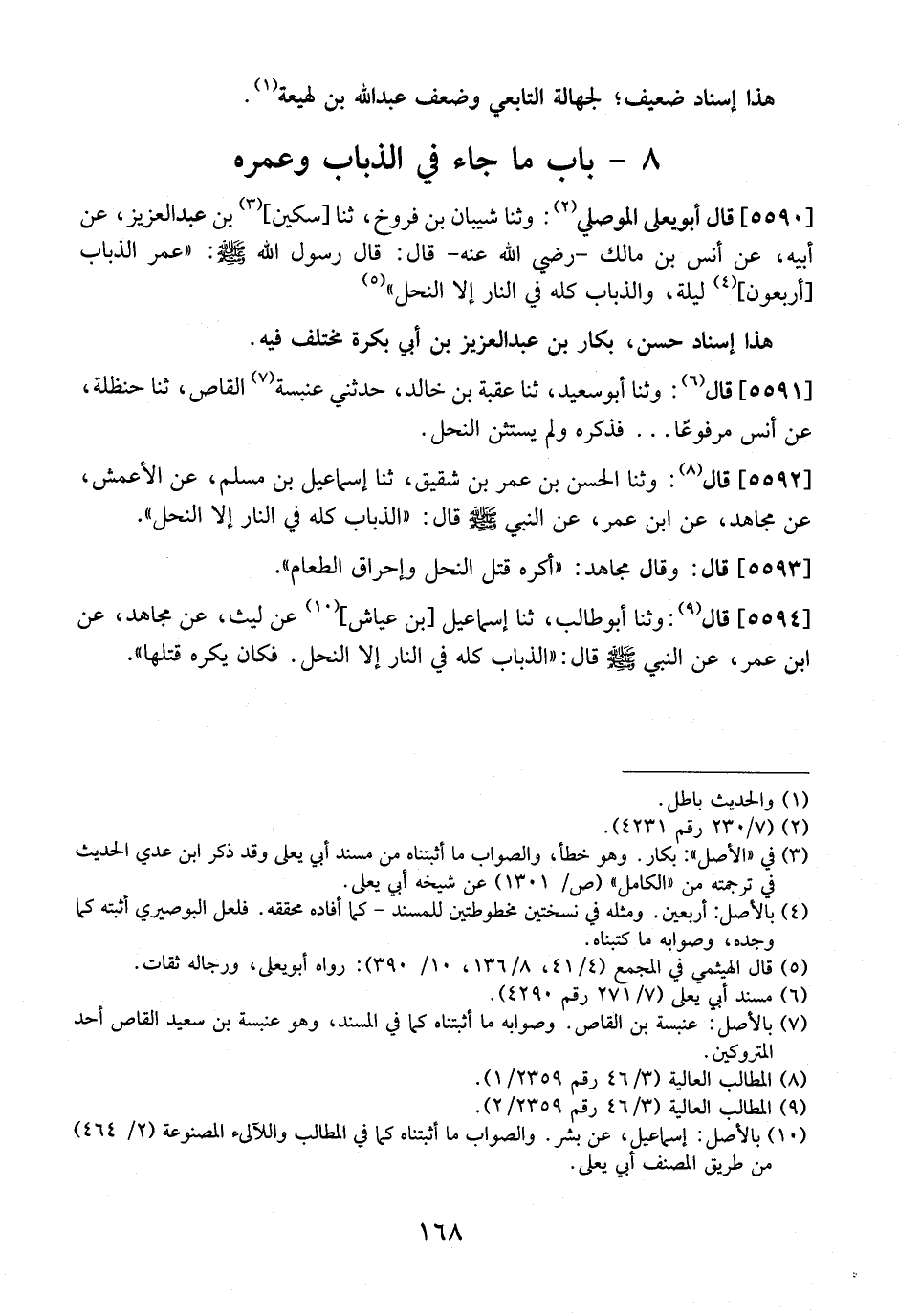 5590 - قَالَ أَبُو يَعْلَى الْمُوصِلِيُّ: وَثنا شَيْبَانُ بْنُ فروخ، ثنا سكين، بْنُ عَبْدِ الْعَزِيزِ، عَنْ أَبِيهِ، عَنْ أَنَسِ بْنِ مَالِكٍ- رَضِيَ اللَّهُ عَنْهُ- قَالَ: قَالَ رَسُولُ اللَّهِ - صَلَّى اللَّهُ عَلَيْهِ وَسَلَّمَ -: "عُمْرُ الذُّبَابِ أَرْبَعُونَ لَيْلَةً، وَالذُّبَابُ كُلُّهُ فِي النَّارِ إِلَّا النَّحْلَ"