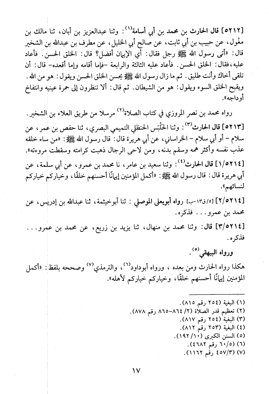 5214 / 1 - قَالَ الْحَارِثُ: وثنا سعيد بن عامر، نا مُحَمَّدِ بْنِ عَمْرٍو، عَنْ أَبِي سَلَمَةَ، عَنْ أَبِي هُرَيْرَةَ قَالَ: قَالَ رَسُولُ اللَّهِ - صَلَّى اللَّهُ عَلَيْهِ وَسَلَّمَ -: "أَكْمَلُ الْمُؤْمِنِينَ إِيمَانًا أَحْسَنُهُمْ خُلُقًا، وَخِيَارُكُمْ خِيَارُكُمْ لِنِسَائِهِمْ".