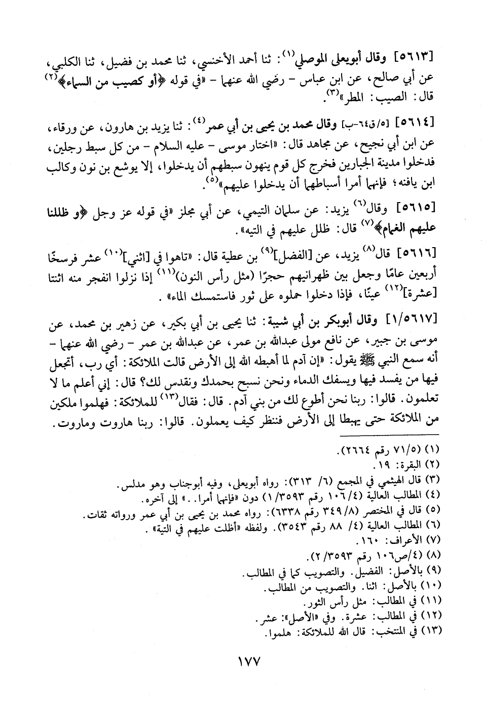 5617 / 1 - وَقَالَ أَبُو بَكْرِ بْنُ أَبِي شَيْبَةَ: ثنا يَحْيَى بْنُ أَبِي بَكْيرٍ، عَنْ زُهَيْرِ بْنِ مُحَمَّدٍ، عَنْ مُوسَى بْنِ جُبَيْرٍ، عَنْ نَافِعٍ مَوْلَى عَبْدِ اللَّهِ بْنِ عُمَرَ، عَنْ عَبْدَ اللَّهِ بْنَ عُمَرَ- رَضِيَ اللَّهُ عَنْهُمَا- أَنَّهُ سَمِعَ النَّبِيَّ - صَلَّى اللَّهُ عَلَيْهِ وَسَلَّمَ - يَقُولُ: "أَنَّ آدَمَ لَمَّا أَهْبَطَهُ اللِّه إِلَى الْأَرْضِ قَالَتِ الْمَلَائِكَةُ: أَيْ رَبِّ، أَتَجْعَلُ فِيهَا مَنْ يُفْسِدُ فِيهَا وَيَسْفِكُ الدِّمَاءَ وَنَحْنُ نُسَبِّحُ بِحَمْدِكَ وَنُقَدِّسُ لَكَ؟ قَالَ: إِنِّي أَعْلَمُ ما لا تعلمون. قَالُوا: رَبَّنَا نَحْنُ أَطْوَعُ لَكَ مِنْ بَنِي آدَمَ. قَالَ: فَقَالَ لِلْمَلَائِكَةِ: فَهَلُمُّوا مَلَكَيْنِ مِنَ الْمَلَائِكَةِ حَتَّى يَهْبِطَا إِلَى الْأَرْضِ فَنَنْظُرُ كَيْفَ يَعْمَلُونَ. قَالُوا: رَبَّنَا هَارُوتُ وَمَارُوتُ.