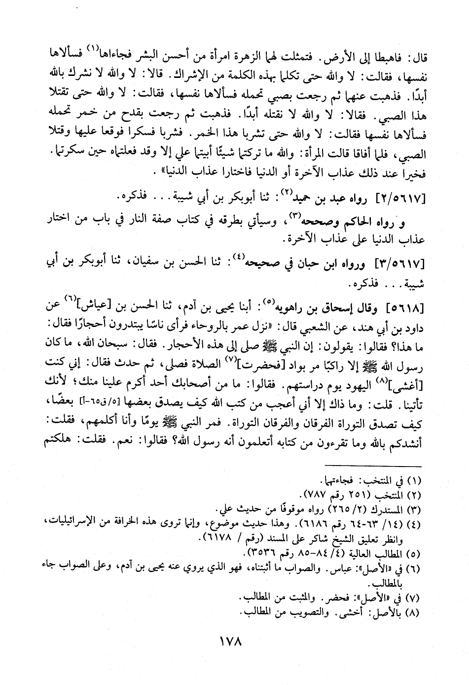 5618 - وَقَالَ إِسْحَاقُ بْنُ راهويه: أبنا يَحْيَى بْنُ آدَمَ، ثَنَا الْحَسَنُ بْنُ عَيَّاشٍ، عَنْ دَاوُدُ بْنُ أَبِي هِنْدٍ، عَنِ الشَّعْبِيِّ قَالَ: "نَزَلَ عُمَرُ بِالرَّوْحَاءِ فَرَأَى نَاسًا يَبْتَدِرُونَ أَحْجَارًا فَقَالَ: مَا هَذَا؟ فَقَالُوا: يَقُولُونَ: أَنَّ النَّبِيَّ - صَلَّى اللَّهُ عَلَيْهِ وَسَلَّمَ - صَلَّى إِلَى هَذِهِ الْأَحْجَارِ. فَقَالَ: سُبْحَانَ اللَّهِ، مَا كَانَ رَسُولُ اللَّهِ - صَلَّى اللَّهُ عَلَيْهِ وَسَلَّمَ - ألا راكباً مر بواد فحضرت، الصَّلَاةَ فَصَلَّى، ثُمَّ حَدَّثَ فَقَالَ: إِنِّي كُنْتُ أغشى، اليهود يوم دراستهم. فَقَالُوا: مَا مِنْ أَصْحَابِكَ أَحَدٌ أَكْرَمُ عَلَيْنَا مِنْكَ؟ لِأَنَّكَ تَأْتِينَا. قُلْتُ: وَمَا ذَاكَ إِلَّا أَنِيِّ أَعْجَبُ مِنْ كُتُبِ اللَّهِ كَيْفَ يُصَدِّقُ بعضها بعضاً، كيف تصدق التَّوْرَاةُ الْفُرْقَانَ وَالْفُرْقَانُ التَّوْرَاةَ. فَمَرَّ النَّبِيُّ - صَلَّى اللَّهُ عَلَيْهِ وَسَلَّمَ - يَوْمًا وَأَنَا أُكَلِّمُهُمْ، فَقُلْتُ: أَنْشِدُكُمْ بِاللَّهِ وَمَا تَقْرَءُونَ مِنْ كِتَابِهِ أَتَعْلَمُونَ أَنَّهُ رَسُولُ اللَّهِ؟ فَقَالُوا: نَعَمْ. فَقُلْتُ: هَلَكْتُمْ