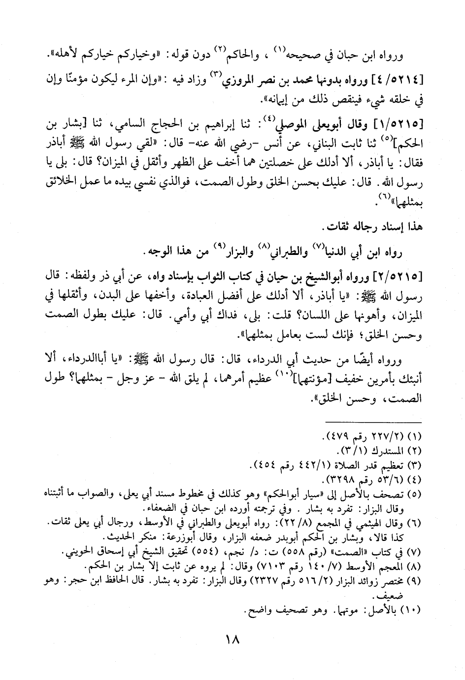 5215 / 1 - وَقَالَ أَبُو يَعْلَى الْمَوْصِلِيُّ: ثَنَا إِبْرَاهِيمُ بْنُ الْحَجَّاجِ السَّامِيُّ، ثَنَا بشار بن الْحَكَمِ، ثَنَا ثَابِتٌ الْبُنَانِيُّ، عَنْ أَنَسٍ- رَضِيَ اللَّهُ عَنْهُ- قَالَ: "لَقِيَ رَسُولَ اللَّهِ - صَلَّى اللَّهُ عَلَيْهِ وَسَلَّمَ - أَبَا ذَرٍّ فَقَالَ: يَا أَبَا ذَرٍّ، أَلَا أَدُلُّكَ عَلَى خَصْلَتَيْنِ هُمَا أَخَفُّ عَلَى الظَّهْرِ وَأَثْقَلُ فِي الْمِيزَانِ؟ قَالَ: بَلَى يَا رَسُولَ اللَّهِ. قَالَ: عَلَيْكَ بِحُسْنِ الخلق وطول الصمت، فو الذي نَفْسِي بِيَدِهِ مَا عَمِلَ الْخَلَائِقُ بِمِثْلِهِمَا".