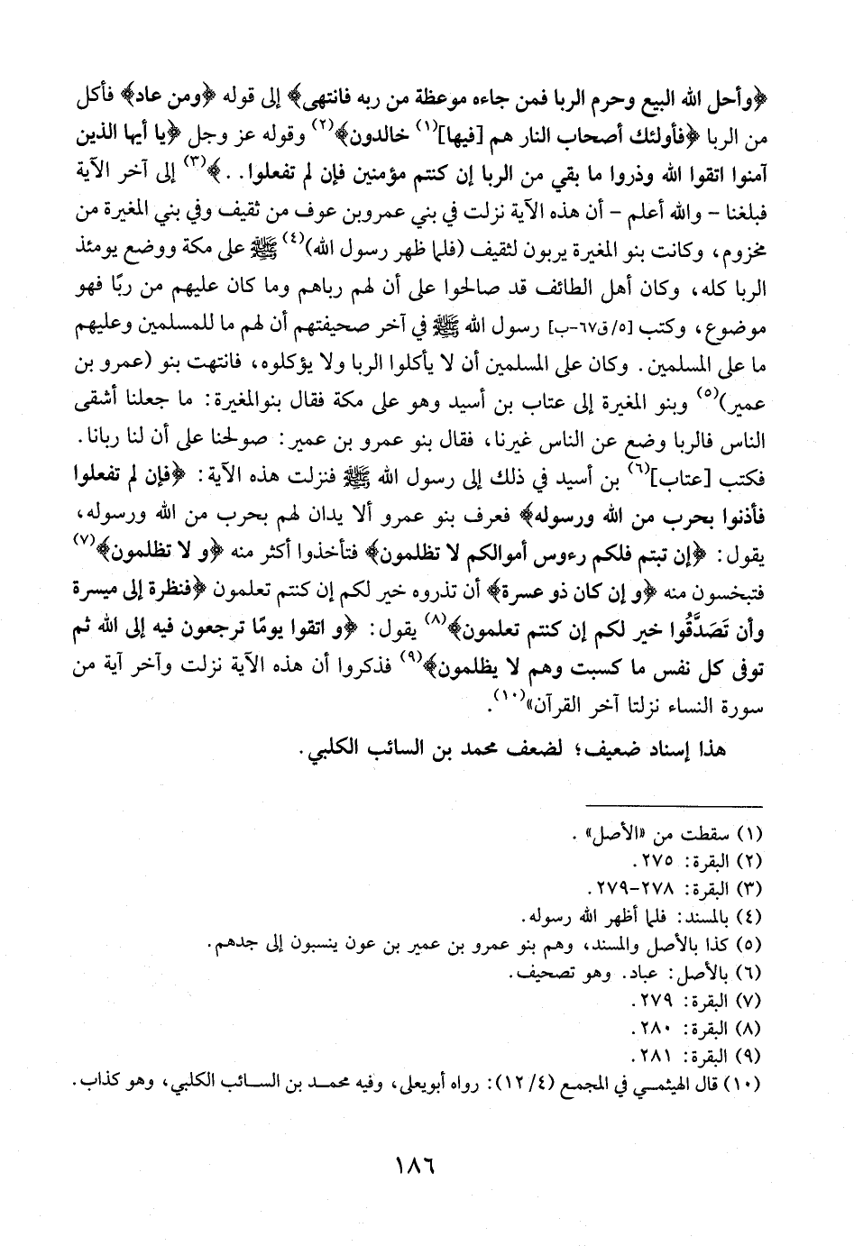 (وَأَحَلَّ اللَّهُ الْبَيْعَ وَحَرَّمَ الرِّبَا فَمَنْ جَاءَهُ موعظة من ربه فانتهى) إلى قوله (ومن عاد) فَأَكَلَ مِنَ الرِّبَا فَأُولَئِكَ أَصْحَابُ النَّارِ هُمْ فِيهَا خَالِدُونَ وقوله عز وجل (يا أيها الَّذِينَ آمَنُوا اتَّقُوا اللَّهَ وَذَرُوا مَا بَقِيَ مِنَ الرِّبَا إِنْ كُنْتُمْ مُؤْمِنِينَ فَإِنْ لَمْ تفعلوا) إِلَى آخِرِ الْآيَةِ فَبَلَغَنَا- وَاللَّهُ أَعْلَمُ- أَنَّ هَذِهِ الْآيَةَ نَزَلَتْ فِي بَنِي عَمْرِو بْنِ عَوْفٍ مِنْ ثَقِيفٍ وَفِي بَنِي الْمُغِيرَةِ مِنْ مَخْزُومٍ، وَكَانَتْ بَنُو الْمُغِيرَةِ يَرْبُونَ لِثَقِيفٍ فَلَمَّا ظَهْرِ رَسُولِ اللَّهِ - صَلَّى اللَّهُ عَلَيْهِ وَسَلَّمَ - عَلَى مَكَّةَ وَوَضَعَ يَوْمَئِذٍ الرِّبَا كُلَّهُ، وَكَانَ أَهْلُ الطَّائِفِ قَدْ صَالَحُوا عَلَى أَنَّ لَهُمْ رِبَاهُمْ وَمَا كَانَ عَلَيْهِمْ مِنْ رِبًا فَهُوَ مَوْضُوعٌ، وَكَتَبَ رَسُولُ اللَّهِ - صَلَّى اللَّهُ عَلَيْهِ وَسَلَّمَ - فِي آخِرِ صَحِيفَتِهِمْ أَنَّ لَهُمْ مَا لِلْمُسْلِمِينَ وَعَلَيْهِمْ مَا عَلَى الْمُسْلِمِينَ. وَكَانَ عَلَى الْمُسْلِمِينَ أَنْ لَا يَأْكُلُوا الرِّبَا وَلَا يُؤَكِّلُوهُ، فَانْتَهَتْ بَنُو عَمْرِو بْنِ عُمَيْرٍ وَبَنُو الْمُغِيرَةِ إِلَى عَتَّابِ بْنِ أُسَيْدٍ وَهُوَ عَلَى مَكَّةَ فَقَالَ بَنُو الْمُغِيرَةِ: مَا جَعَلَنَا أَشْقَى النَّاسِ فالربا وضع عَنِ النَّاسِ غَيْرِنَا، فَقَالَ بَنُو عَمْرِو بْنِ عُمَيْرٍ: صُولِحْنَا عَلَى أَنَّ لَنَا رِبَانَا. فَكَتَبَ عَتَّابُ، بْنُ أُسَيْدٍ فِي ذَلِكَ إِلَى رَسُولِ اللَّهِ - صَلَّى اللَّهُ عَلَيْهِ وَسَلَّمَ - فَنَزَلَتْ هَذِهِ الْآيَةُ: (فَإِنْ لَمْ تَفْعَلُوا فَأْذَنُوا بِحَرْبٍ مِنَ الله ورسوله) فَعَرَفَ بَنُو عَمْرٍو أَلَّا يُدَانَ لَهُمْ بِحَرْبٍ من الله ورسوله، يقول: (إن تبتم فلكم رؤس أموالكم لا تظلمون) فتأخذوا أكثر منه (وَلَا تُظْلَمُونَ) فَتُبْخَسُونَ مِنْهُ (وَإِنْ كَانَ ذُو عسرة) أَنْ تَذَرُوهُ خَيْرٌ لَكُمْ إِنْ كُنْتُمْ تَعْلَمُونَ (فَنَظِرَةٌ إِلَى مَيْسَرَةٍ وَأَنْ تَصَدَّقُوا خَيْرٌ لَكُمْ إن كنتم تعلمون) يَقُولُ: (وَاتَّقُوا يَوْمًا تُرْجَعُونَ فِيهِ إِلَى اللَّهِ ثُمَّ تُوَفَّى كُلُّ نَفْسٍ مَا كَسَبَتْ وَهُمْ لا يظلمون) فَذَكَرُوا أَنَّ هَذِهِ الْآيَةَ نَزَلَتْ وَآخِرَ آيَةٍ من سورة النساء نزلتا آخِرَ الْقُرْآنَ".