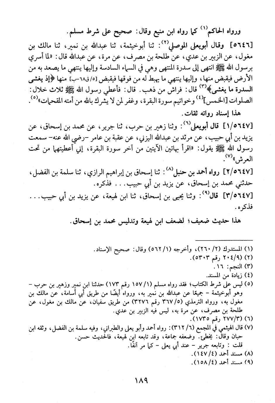 5646 - وَقَالَ أَبُو يَعْلَى الْمُوصِلِيُّ: ثَنَا أَبُو خَيْثَمَةَ، ثنا عبد الله بْنُ نُمَيْرٍ، ثَنَا مَالِكُ بْنُ مِغْوَلٍ، عَنِ الزُّبَيْرِ بْنِ عَدِيٍّ، عَنْ طَلْحَةَ بْنِ مُصَرِّفٍ، عَنْ مُرَّةَ، عَنْ عَبْدِ اللَّهِ قَالَ: "لَمَّا أُسْرِيَ بِرَسُولِ اللَّهِ - صَلَّى اللَّهُ عَلَيْهِ وَسَلَّمَ - انْتَهَى إِلَى سِدْرَةِ الْمُنْتَهَى وَهِيَ فِي السَّمَاءِ السَّادِسَةِ وَإِلَيْهَا يَنْتَهِي مَا يُصْعَدُ بِهِ مِنَ الْأَرْضِ فَيَقْبِضُ مِنْهَا، وَإِلَيْهَا يَنْتَهِي مَا يَهْبِطُ لَهُ مِنْ فَوْقِهَا فَيَقْبِضُ مِنْهَا (إِذْ يَغْشَى السدرة ما يغشى) قَالَ: فِرَاشٌ مِنْ ذَهَبٍ. قَالَ: فَأُعْطِيَ رَسُولِ اللَّهِ - صَلَّى اللَّهُ عَلَيْهِ وَسَلَّمَ - ثَلَاثَ خِلَالٍ: الصلوات الخمس، وَخَوَاتِيمَ سُورَةِ الْبَقَرَةِ، وَغُفِرَ لِمَنْ لَا يُشْرِكُ بِاللَّهِ مِنْ أُمَّتِهِ الْمُقْحَمَاتِ". هَذَا إِسْنَادٌ رُوَاتُهُ ثِقَاتٌ.
