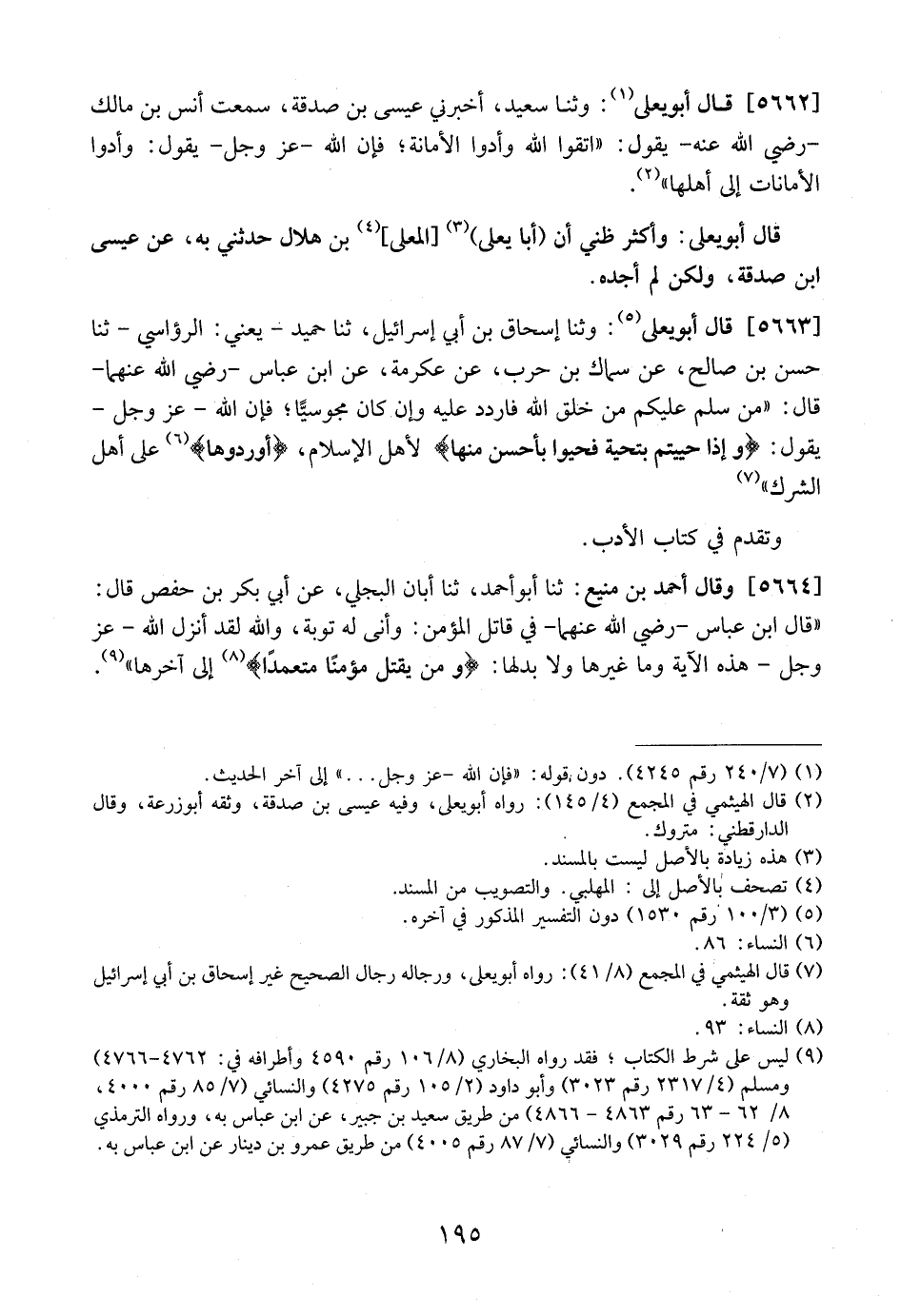 5662 - قَالَ أَبُو يَعْلَى: وَثَنا سَعِيدٌ، أَخْبَرَنِي عِيسَى بْنُ صَدَقَةَ، سَمِعْتُ أَنَسَ بْنَ مَالِكٍ - رَضِيَ اللَّهُ عَنْهُ- يَقُولُ: "اتَّقُوا اللَّهَ وَأَدُّوا الْأَمَانَةَ، فَإِنَّ اللَّهَ- عَزَّ وَجَلَّ- يَقُولُ: وَأَدُّوا الْأَمَانَاتِ إِلَى أَهْلِهَا".
