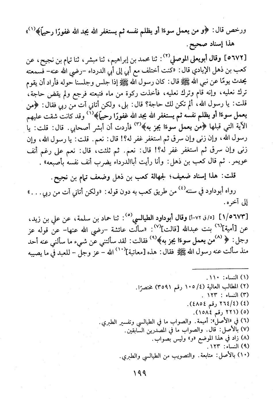 5672 - وَقَالَ أَبُو يَعْلَى الْمَوْصِلِيُّ: ثَنَا مُحَمَّدُ بْنُ إِبْرَاهِيمَ، ثَنَا مُبَشِّرٌ، ثَنَا تَمَّامُ بْنُ نَجِيحٍ، عَنْ كَعْبِ بْنِ ذَهْلٍ الْإِيَادِيِّ قَالَ: "كُنْتُ أَخْتَلِفُ مَعَ أَبِي إِلَى أَبِي الدَّرْدَاءِ- رَضِيَ اللَّهُ عَنْهُ- فَسَمِعْتُهُ يُحَدِّثُ يَوْمًا عَنْ نَبِيِّ اللَّهِ - صَلَّى اللَّهُ عَلَيْهِ وَسَلَّمَ - قَالَ: كَانَ رَسُولُ اللَّهِ - صَلَّى اللَّهُ عَلَيْهِ وَسَلَّمَ - إِذَا جَلَسَ وَجَلَسْنَا حَوْلَهُ فَأَرَادَ أَنْ يَقُومَ تَرَكَ نَعْلَيْهِ، وَإِنَّهُ قَامَ وَتَرَكَ نَعْلَيْهِ، فَأَخَذْتُ رِكْوَةً مِنْ مَاءٍ فَتَبِعْتُهُ فَرَجَعَ وَلَمْ يَقْضِ حَاجَةً، قُلْتُ: يَا رَسُولَ اللَّهِ، أَلَمْ تَكُنْ لَكَ حَاجَةٌ؟ قَالَ: بَلَى، وَلَكِنْ أتاني آت من ربي فقال: (من يَعْمَلْ سُوءًا أَوْ يَظْلِمْ نَفْسَهُ ثُمَّ يَسْتَغْفِرِ الله يجد الله غفوراً رحيمَاً) وَقَدْ كَانَتْ شَقَّتْ عَلَيْهِمُ الْآيَةُ الَّتِي قَبْلَهَا (من يعمل سوءاً يجز به) فَأَرَدْتُ أَنْ أُبَشِّرَ أَصْحَابِي. قَالَ: قُلْتُ: يَا رَسُولَ اللَّهِ، وَإِنْ زَنَى وَإِنْ سَرَقَ ثُمَّ اسْتَغْفَرَ غُفِرَ لَهُ؟! قَالَ: نعم. قُلْتُ: يَا رَسُولَ اللَّهِ، وَإِنْ زَنَى وَإِنْ سَرَقَ ثُمَّ اسْتَغْفَرَ غُفِرَ لَهُ؟! قَالَ: نَعَمْ. ثُمَّ ثَلَّثْتُ، قَالَ: نَعَمْ عَلَى رَغْمِ أَنْفِ عُوَيْمِرٍ. ثُمَّ قَالَ كَعْبُ بْنُ ذَهْلٍ: وَأَنَا رَأَيْتُ أَبَا الدَّرْدَاءِ يَضْرِبُ أَنْفَ نَفْسَهُ بأصبعه". قلت: هذا إسناد ضعيف؟ لجهالة كعب بن ذهل وضعف تمام بن نجيح.