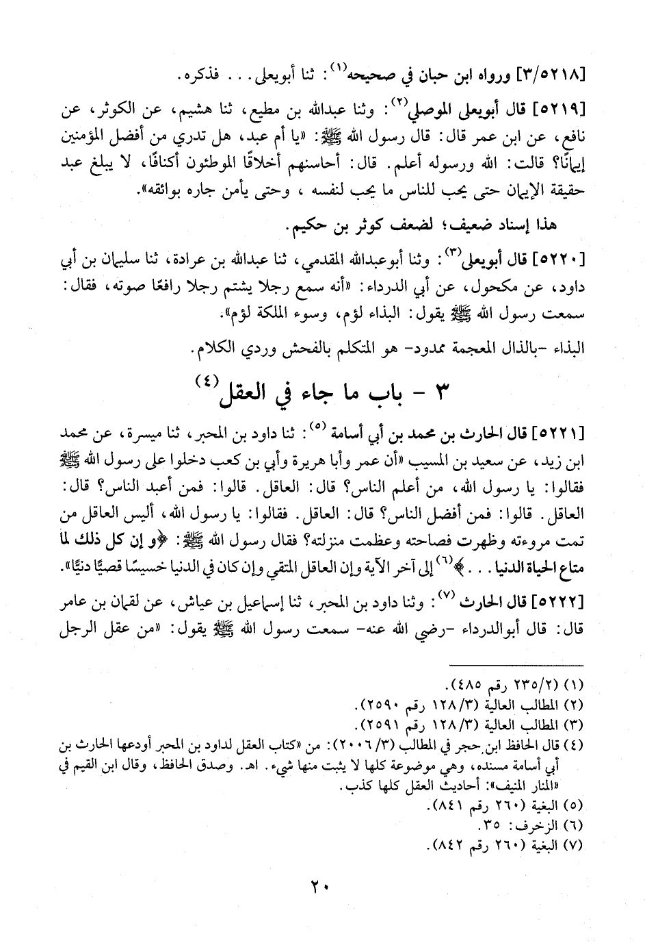 5222 - قَالَ الْحَارِثُ: وَثَنَا دَاوُدُ بْنُ الْمُحَبَّرِ، ثَنَا إِسْمَاعِيلُ بْنُ عَيَّاشٍ، عَنْ لُقْمَانَ بْنِ عَامِرٍ قَالَ: قَالَ أَبُو الدَّرْدَاءِ- رَضِيَ اللَّهُ عَنْهُ- سَمِعْتُ رَسُولَ اللَّهِ - صَلَّى الله عليه وسلم - يقول: "مِنْ عَقْلِ الرَّجُلِ