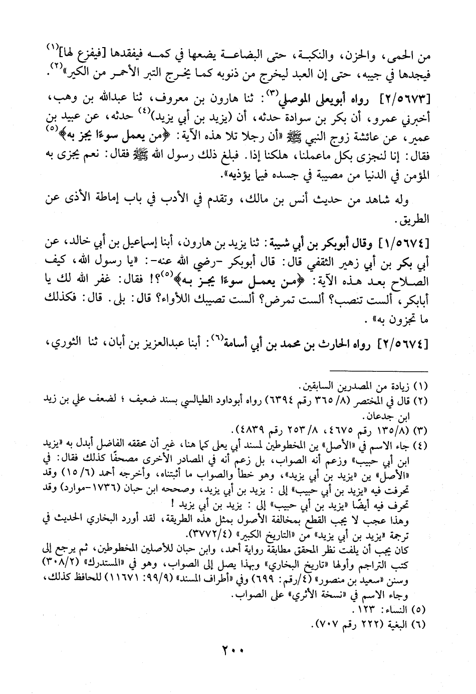 5673 / 2 - رَوَاهُ أَبُو يَعْلَى الْمَوْصِلِيُّ: ثَنَا هَارُونُ بْنُ مَعْرُوفٍ، ثنا عبد الله بن وهب، أخبرني عمرو، أن بَكْرَ بْنَ سَوَادَةَ حَدَّثَهُ، أَنَّ يَزِيدَ بْنَ أَبِي يَزِيدَ حَدَّثَهُ، عَنْ عُبَيْدِ بْنِ عُمَيْرٍ، عَنْ عَائِشَةَ زَوْجِ النَّبِيِّ - صَلَّى اللَّهُ عَلَيْهِ وَسَلَّمَ - "أَنَّ رَجُلًا تَلَا هَذِهِ الْآيَةَ: (مَنْ يعمل سوءاً يجز به) فقال: إنا لَنُجْزَى بِكُلِّ مَا عَمِلْنَا، هَلَكْنَا إِذًا. فَبَلَغَ ذَلِكَ رَسُولَ اللَّهِ - صَلَّى اللَّهُ عَلَيْهِ وَسَلَّمَ - فقال: نعم لمجزى بِهِ الْمُؤْمِنُ فِي الدُّنْيَا مِنْ مُصِيبَةٍ فِي جَسَدِهِ فِيمَا يُؤْذِيهِ".