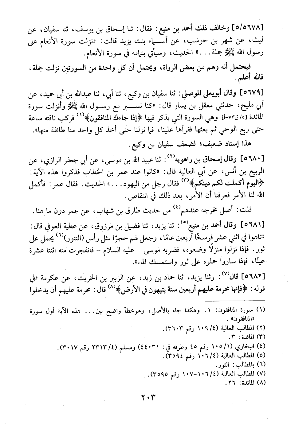 5678 / 5 - وَخَالَفَ ذَلِكَ أَحْمَدُ بْنُ مَنِيعٍ: فَقَالَ: ثَنَا إِسْحَاقُ بْنُ يُوسُفَ، ثَنَا سُفْيَانُ، عَنْ لَيْثٍ، عَنْ شَهْرِ بْنِ حَوْشَبٍ، عَنْ أَسْمَاءَ بْنِتِ يَزِيدَ قَالَتْ: "نَزَلَتْ سُورَةُ الْأَنْعَامِ عَلَى رَسُولِ اللَّهِ - صَلَّى اللَّهُ عَلَيْهِ وَسَلَّمَ - جُمْلَةً ... " الْحَدِيثَ، وسيأتي بتمامه في سورة الأنعام.
