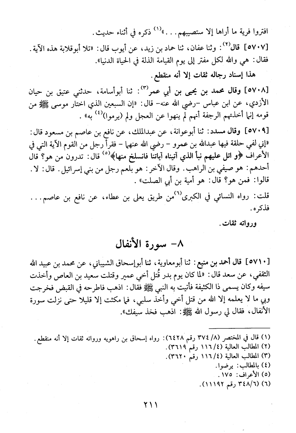 5710 - قَالَ أَحْمَدُ بْنُ مَنِيعٍ: ثَنَا أَبُو مُعَاوِيَةَ، ثَنَا أَبُو إِسْحَاقَ الشَّيْبَانِيِّ، عَنْ مُحَمَّدِ بْنِ عُبَيْدِ اللَّهِ الثَّقَفِيِّ، عَنْ سَعْدٍ قَالَ: "لَمَّا كَانَ يَوْمُ بَدْرٍ قُتل أَخِي عُمَيْرٍ وَقَتَلْتُ سَعِيدَ بْنَ الْعَاصِ وَأَخَذْتُ سَيْفَهُ وَكَانَ يُسَمَّى ذَا الْكَثِيفَةِ فَأَتَيْتُ بِهِ النَّبِيَّ - صَلَّى اللَّهُ عَلَيْهِ وَسَلَّمَ - فَقَالَ: اذْهَبْ فَاطْرَحْهُ فِي الْقَبْضِ فَخَرَجْتُ وبي مَا لَا يَعْلَمُهُ إِلَّا اللَّهُ مِنْ قَتْلِ أَخِي وَأَخْذِ سَلْبِي، فَمَا مَكَثْتُ إِلَّا قَلِيلًا حَتَّى نَزَلَتْ سُورَةُ الْأَنْفَالِ، فَقَالَ لِي رَسُولُ اللَّهِ - صَلَّى اللَّهُ عَلَيْهِ وَسَلَّمَ -: اذْهَبْ فَخُذْ سَيْفَكَ".