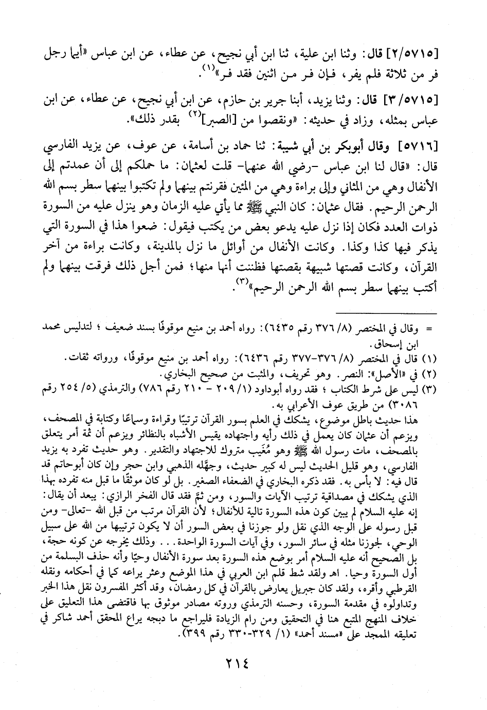 5716 - وَقَالَ أَبُو بَكْرِ بْنُ أَبِي شَيْبَةَ: ثَنَا حَمَّادُ بْنُ أُسَامَةَ، عَنْ عَوْفٍ، عَنْ يَزِيدَ الْفَارِسِيِّ قَالَ: "قَالَ لَنَا ابْنُ عَبَّاسٍ- رَضِيَ اللَّهُ عَنْهُمَا- قُلْتُ لِعُثْمَانَ: مَا حملكم إلى أن عمدتم إِلَى الْأَنْفَالِ وَهِيَ مِنَ الْمَثَانِي وَإِلَى بَرَاءَةٍ وَهِيَ مِنَ الْمِئِينَ فَقَرَنْتُمْ بَيْنَهُمَا وَلَمْ تَكْتُبُوا بَيْنَهُمَا سَطْرَ بِسْمِ اللَّهِ الرَّحْمَنِ الرَّحِيمِ. فَقَالَ عُثْمَانُ: كَانَ النَّبِيُّ - صَلَّى اللَّهُ عَلَيْهِ وَسَلَّمَ - مِمَّا يَأْتِي عَلَيْهِ الزَّمَانُ وَهُوَ يَنْزِلُ عَلَيْهِ مِنَ السُّورَةِ ذَوَاتُ الْعَدَدِ فَكَانَ إِذَا نَزَلَ عَلَيْهِ يَدْعُو بَعْضَ مَنْ يَكْتُبُ فَيَقُولُ: ضَعُوا هذا فِي السُّورَةِ الَّتِي يُذْكَرُ فِيهَا كَذَا وَكَذَا. وَكَانَتِ الْأَنْفَالُ مِنْ أَوَائِلِ مَا نَزَلَ بِالْمَدِينَةِ، وَكَانَتْ بَرَاءَةٌ مِنْ آخِرِ الْقُرْآنِ، وَكَانَتْ قِصَّتُهَا شَبِيهَةٌ بِقِصَّتِهَا فَظَنَنْتُ أَنَّهَا مِنْهَا؟ فَمِنْ أَجْلِ ذَلِكَ فَرَّقْتُ بَيْنَهُمَا وَلَمْ أَكْتُبْ بَيْنَهُمَا سَطْرَ بِسْمِ اللَّهِ الرَّحْمَنِ الرَّحِيمِ".