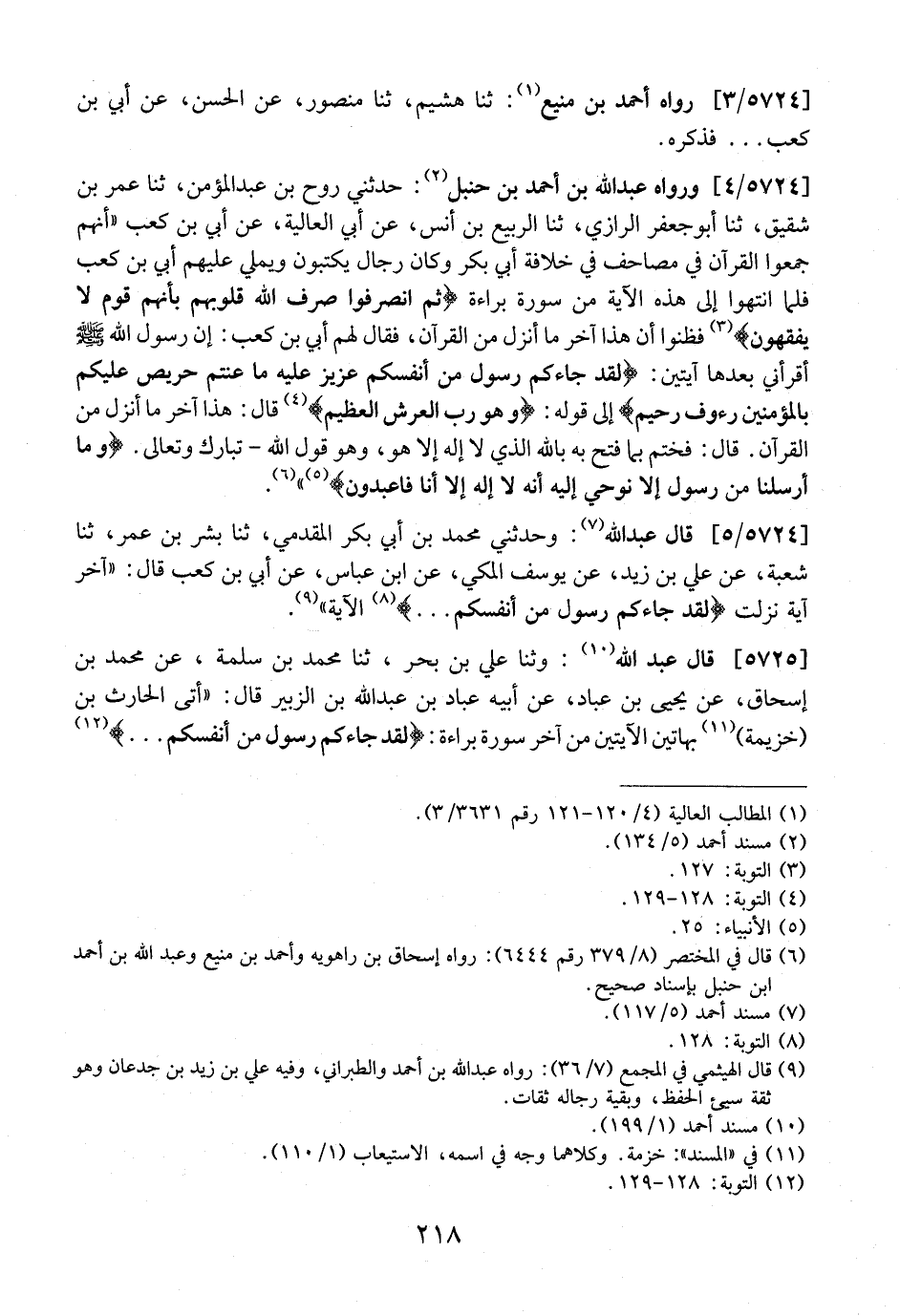 5724 / 4 - وَرَوَاهُ عَبْدُ اللَّهِ بْنُ أَحْمَدَ بْنِ حَنْبَلٍ: حَدَّثَنِي رَوْحُ بْنُ عَبْدِ الْمُؤْمِنِ، ثَنَا عُمَرُ بْنُ شَقِيقٍ، ثَنَا أَبُو جَعْفَرٍ الرَّازِيُّ، ثَنَا الرَّبِيعِ بْنِ أَنَسٍ، عَنْ أَبِي الْعَالِيَةِ، عَنْ أُبَيِّ بْنِ كَعْبٍ "أَنَّهُمْ جَمَعُوا الْقُرْآنَ فِي مَصَاحِفَ فِي خِلَافَةِ أَبِي بَكْرٍ وَكَانَ رجاله يكتبون ويملي عَلَيْهِمْ أُبَيُّ بْنُ كَعْبٍ فَلَمَّا انْتَهَوْا إِلَى هَذِهِ الْآيَةِ مِنْ سُورَةِ بَرَاءَةٌ (ثُمَّ انْصَرَفُوا صَرَفَ اللَّهُ قُلُوبَهُمْ بِأَنَّهُمْ قَوْمٌ لا يَفْقَهُونَ) فَظَنُّوا أَنَّ هَذَا آخِرَ مَا أُنْزِلَ مِنَ الْقُرْآنِ، فَقَالَ لَهُمْ أُبَيُّ بْنِ كَعْبٍ: أَنّ رَسُولَ اللَّهِ - صَلَّى اللَّهُ عَلَيْهِ وَسَلَّمَ - أَقْرَأَنِي بَعْدَهَا آيَتَيْنِ: (لَقَدْ جَاءَكُمْ رَسُولٌ مِنْ أَنْفُسِكُمْ عَزِيزٌ عَلَيْهِ مَا عَنِتُّمْ حَرِيصٌ عَلَيْكُمْ بِالْمُؤْمِنِينَ رءوف رحيم) إلى قوله: (وهو رب العرش العظيم) قَالَ: هَذَا آخِرُ مَا أُنْزِلَ مِنَ الْقُرْآنِ. قَالَ: فَخَتَمَ بِمَا فَتَحَ بِهِ بِاللَّهِ الَّذِي لَا إِلَهَ إِلَّا هُوَ، وَهُوَ قَوْلُ اللَّهِ- تبارك وتعالى: (وما أرسلنا مِنْ رَسُولٍ إِلا نُوحِي إِلَيْهِ أَنَّهُ لا إله إلا أنا فاعبدون) .