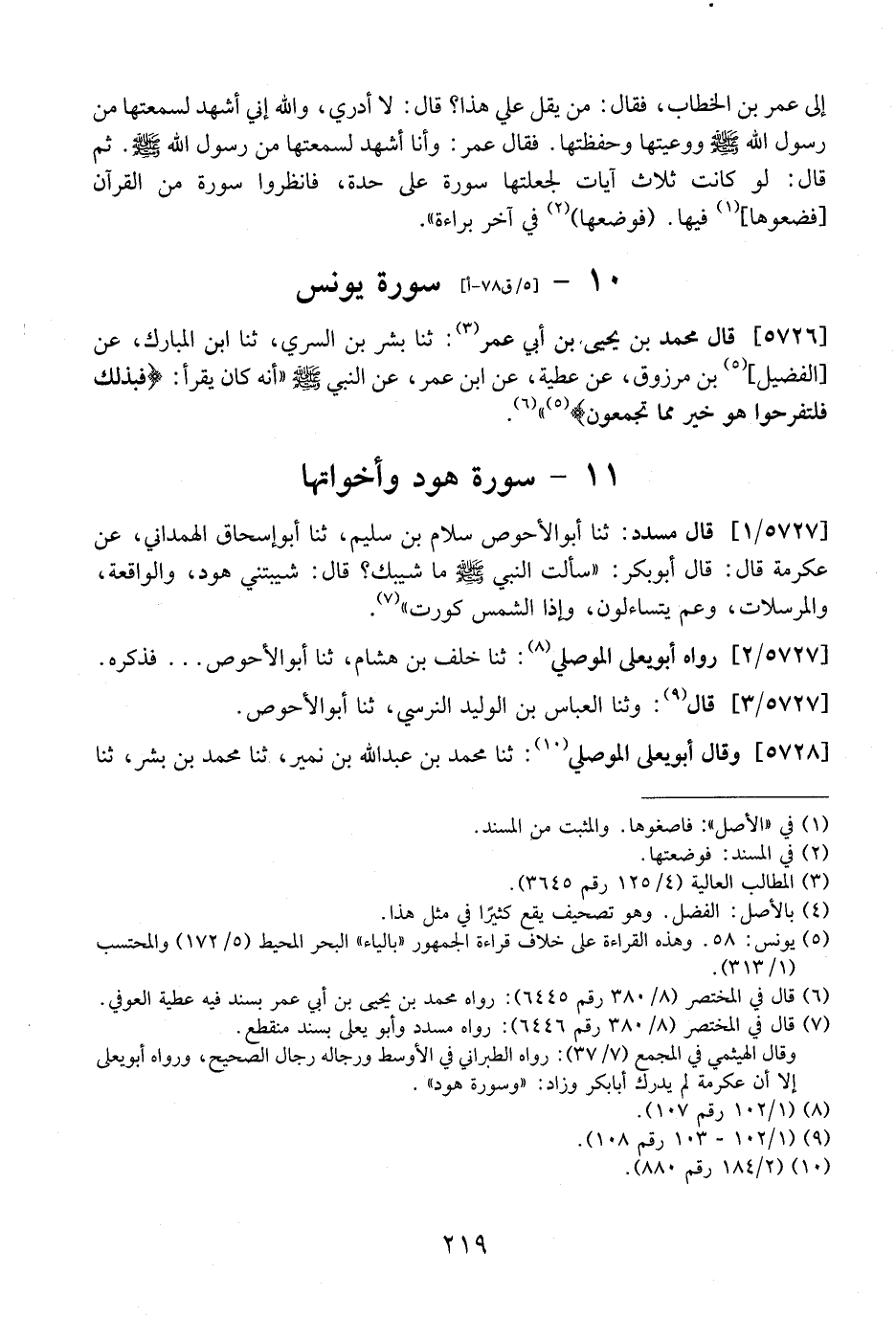 5727 / 1 - قَالَ مُسَدَّدٌ: ثَنَا أَبُو الْأَحْوَصِ سَلَّامُ بْنُ سُلَيْمٍ، ثَنَا أَبُو إِسْحَاقَ الْهَمْدَانِيُّ، عَنْ عِكْرِمَةَ قَالَ: قَالَ أَبُو بَكْرٍ: "سَأَلْتُ النَّبِيَّ - صَلَّى اللَّهُ عَلَيْهِ وَسَلَّمَ - مَا شَيَّبَكَ؟ قَالَ: شَيَّبَتْنِي هُودٌ، وَالْوَاقِعَةُ، وَالْمُرْسَلَاتُ، وَعَمَّ يَتَسَاءَلُونَ، وَإِذَا الشَّمْسُ كُوِّرَتْ".