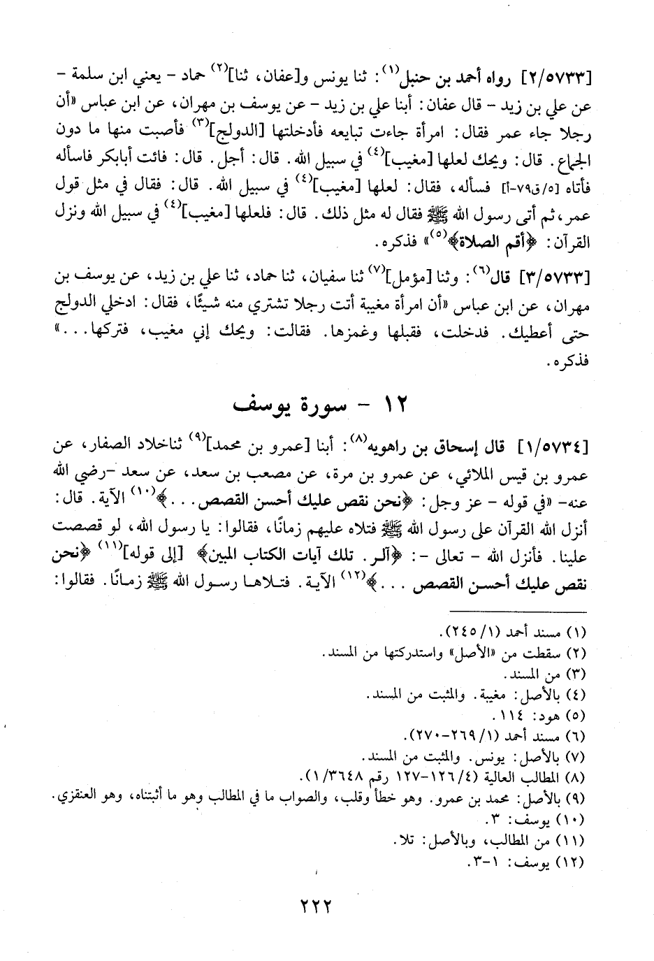 5733 / 2 - رواه أحمد بن حنبل ثنا يونس وعفان، ثَنَا، حَمَّادٌ- يَعْنِي ابْنَ سَلَمَةَ- عَنْ عَلِيِّ بْنِ زَيْدٍ- قال عفان: أبنا عَلِيِّ بْنِ زَيْدٍ- عَنْ يُوسُفَ بْنِ مِهْرَانَ، عَنِ ابْنِ عَبَّاسٍ "أَنَّ رَجُلًا جَاءَ عُمَرَ فقال: امرأة جاءت تبايعه فأدخلتها الدولج، فَأَصَبْتُ مِنْهَا مَا دُونَ الْجِمَاعِ. قَالَ: وَيْحَكَ لعلها مغيب، في سبيل الله. قال: أجل. قال: فائت أَبَا بَكْرٍ فَاسْأَلْهُ فَأَتَاهُ، فَسَأَلَهُ، فَقَالَ: لَعَلَّهَا مغيب، فِي سَبِيلِ اللَّهِ. قَالَ: فَقَالَ فِيَّ مِثْلُ قَوْلِ عُمَرَ، ثُمَّ أَتَى رَسُولَ اللَّهِ - صَلَّى اللَّهُ عَلَيْهِ وَسَلَّمَ - فَقَالَ لَهُ مِثْلَ ذَلِكَ. قال: فلعلها مغيب، في سبيل الله ونزل القرآن: (أقم الصلاة) فذكره.