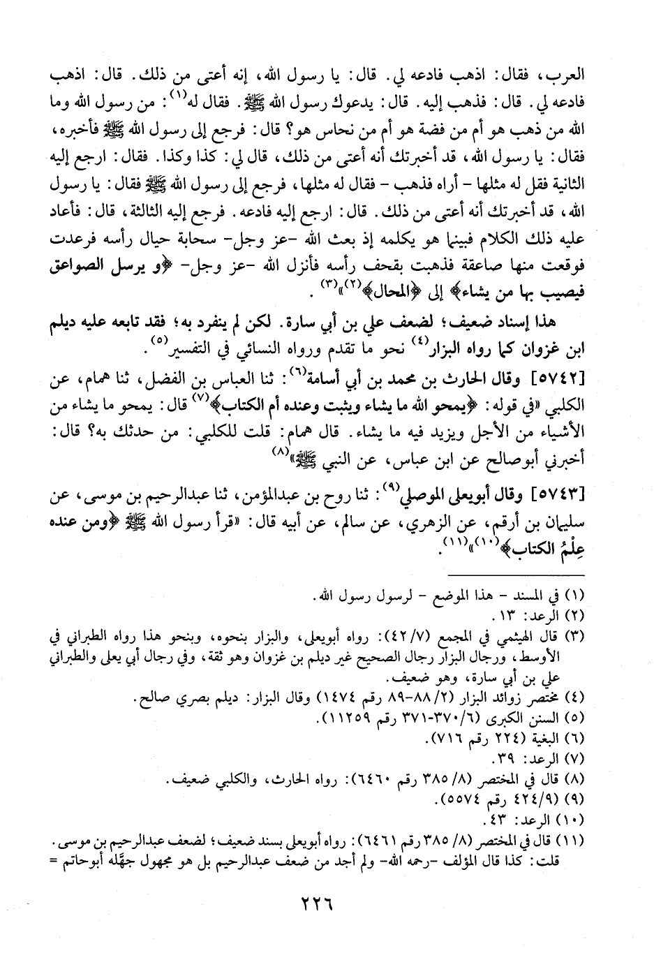 5742 - وَقَالَ الْحَارِثُ بْنُ مُحَمَّدِ بْنِ أَبِي أُسَامَةَ: ثنا الْعَبَّاسُ بْنُ الْفَضْلِ، ثَنَا هَمَّامُ، عَنْ الْكَلْبِيِّ "فِي قَوْلِهِ: (يَمْحُو اللَّهُ مَا يَشَاءُ وَيُثْبِتُ وَعِنْدَهُ أُمُّ الْكِتَابِ) قَالَ: يَمْحُو مَا يَشَاءُ مِنَ الْأَشْيَاءِ مِنَ الْأَجَلِ وَيَزِيدُ فِيهِ مَا يَشَاءُ. قَالَ هَمَّامٌ: قُلْتُ لِلْكَلْبِيِّ: مَنْ حَدَّثَكَ بِهِ؟ قَالَ: أَخْبَرَنِي أَبُو صَالِحٍ عَنِ ابْنِ عَبَّاسٍ، عَنِ النَّبِيِّ - صَلَّى اللَّهُ عَلَيْهِ وَسَلَّمَ -