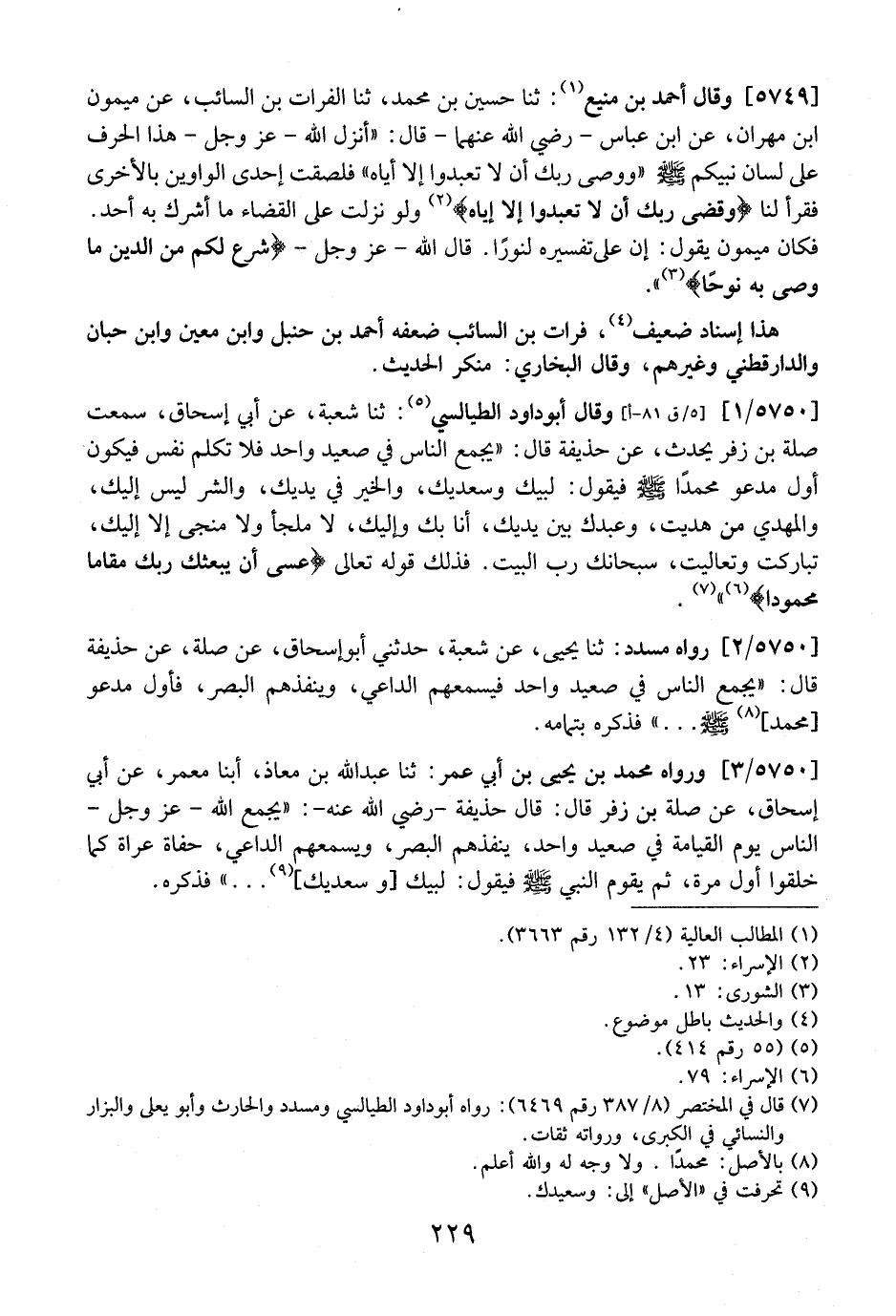 5750 / 2 - رَوَاهُ مُسَدَّدٌ: ثَنَا يَحْيَى، عَنْ شُعْبَةَ، حَدَّثَنِي أَبُو إِسْحَاقَ، عَنْ صِلَةَ، عَنْ حُذَيْفَةَ قَالَ: "يُجْمَعُ النَّاسُ فِي صَعِيدٍ وَاحِدٍ فَيُسْمِعُهُمُ الدَّاعِي، وَيُنْفِذُهُمُ الْبَصَرَ، فَأَوَّلُ مَدْعُوٍّ مُحَّمدٌ صَلَّى اللَّهُ عَلَيْهِ وَسَلَّمَ ... " فَذَكَرَهُ بِتَمَامِهِ.