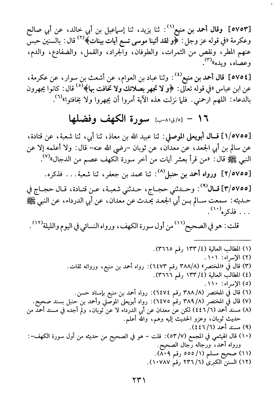 5755 / 1 - قَالَ أَبُو يَعْلَى الْمَوْصِلِيُّ: ثَنَا عُبَيْدُ اللَّهِ بْنُ مُعَاذٍ، ثَنَا أَبِي، ثَنَا شُعْبَةُ، عَنْ قَتَادَةَ، عَنْ سَالِمِ بْنِ أَبِي الْجَعْدِ، عَنْ مَعْدَانَ، عَنْ ثَوْبَانَ- رَضِيَ اللَّهُ عَنْهُ- قَالَ: وَلَا أَعْلَمُهُ إِلَّا عَن ِالنَّبِيِّ - صَلَّى اللَّهُ عَلَيْهِ وَسَلَّمَ - قَالَ: "مَنْ قَرَأَ بِعَشْرِ آيَاتٍ مِنْ آخِرِ سُورَةِ الْكَهْفِ عُصِمَ مِنَ الدَّجَّالِ".
