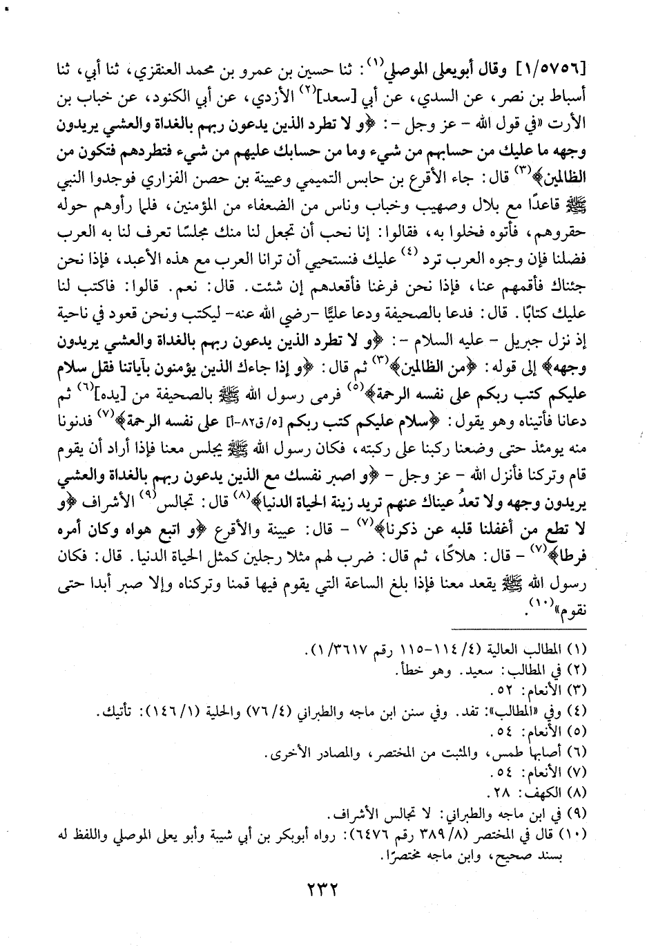5756 / 1 - وَقَالَ أَبُو يَعْلَى الْمَوْصِلِيُّ: ثَنَا حُسَيْنُ بْنُ عَمْرِو بْنِ مُحَمَّدٍ الْعَنْقَزِيُّ، ثَنَا أَبِي، ثَنَا أَسْبَاطُ بْنُ نَصْرٍ، عَنِ السُّدِّيِّ، عَنْ أَبِي سعد، الْأَزْدِيِّ، عَنْ أَبِي الْكَنُودٍ، عَنْ خَبَّابِ بْنِ الأرت "في قول الله- عز وجل-: (ولا تَطْرُدِ الَّذِينَ يَدْعُونَ رَبَّهُمْ بِالْغَدَاةِ وَالْعَشِيِّ يُرِيدُونَ وَجْهَهُ مَا عَلَيْكَ مِنْ حِسَابِهِمْ مِنْ شَيْءٍ وَمَا مِنْ حِسَابِكَ عَلَيْهِمْ مِنْ شَيْءٍ فَتَطْرُدَهُمْ فتكون من الظالمين) قَالَ: جَاءَ الْأَقْرَعُ بْنُ حَابِسٍ التَّمِيمِيُّ وَعُيَيْنَةُ بن حصن الْفَزَارِيُّ فَوَجَدُوا النَّبِيَّ - صَلَّى اللَّهُ عَلَيْهِ وَسَلَّمَ - قَاعِدًا مَعَ بِلَالٍ وَصُهَيْبٍ وَخَبَّابٍ وَنَاسٍ مِنَ الضُّعَفَاءِ مِنَ الْمُؤْمِنِينَ، فَلَمَّا رَأَوْهُمْ حَوْلَهُ حَقَّرُوهُمْ، فأتوه فَخَلَوْا بِهِ، فَقَالُوا: إِنَّا نُحِبُّ أَنْ تَجْعَلَ لَنَا مِنْكَ مَجْلِسًا تَعْرِفُ لَنَا بِهِ الْعَرَبُ فضلنا فإن وجوه العرب ترد عليك فنستحيي أَنْ تَرَانَا الْعَرَبُ مَعَ هَذِِهِ الأَعْبُدِ، فَإِذَا نَحْنُ جِئْنَاكَ فَأَقِمْهُمْ عَنَّا، فَإِذَا نَحْنُ فَرَغْنَا فَأَقْعِدْهُمْ إِنْ شِئْتَ. قَالَ: نَعَمْ. قَالُوا: فَاكْتُبْ لَنَا عَلَيْكَ كِتَابًا. قَالَ: فَدَعَا بِالصَّحِيفَةِ وَدَعَا عَلِيًّا- رَضِيَ اللَّهُ عَنْهُ- لِيَكْتُبَ وَنَحْنُ قُعُودٌ فِي نَاحِيَةٍ إِذْ نَزَلَ جِبْرِيلُ- عَلَيْهِ السَّلَامُ-: (وَلا تَطْرُدِ الَّذِينَ يَدْعُونَ رَبَّهُمْ بِالْغَدَاةِ وَالْعَشِيِّ يريدون وجهه) إلى قوله: (من الظالمين) ثُمَّ قَالَ: (وَإِذَا جَاءَكَ الَّذِينَ يُؤْمِنُونَ بِآيَاتِنَا فَقُلْ سَلامٌ عَلَيْكُمْ كَتَبَ رَبُّكُمْ عَلَى نَفْسِهِ الرحمة) فَرَمَى رَسُولُ اللَّهِ - صَلَّى اللَّهُ عَلَيْهِ وَسَلَّمَ - بِالصَّحِيفَةِ مِنْ يَدِهِ، ثُمَّ دَعَانَا فَأَتَيْنَاهُ وَهُوَ يَقُولُ: (سَلَامٌ عَلَيْكُمْ كَتَبَ رَبُّكُمْ عَلَى نَفْسِهِ الرَّحْمَةَ) فَدَنَوْنَا مِنْهُ يَوْمَئِذٍ حَتَّى وَضَعْنَا رُكَبَنَا عَلَى رُكْبَتِهِ، فَكَانَ رَسُولُ اللَّهِ - صَلَّى اللَّهُ عَلَيْهِ وَسَلَّمَ - يَجْلِسُ مَعَنَا فَإِذَا أَرَادَ أَنْ يَقُومَ قَامَ وَتَرَكَنَا فَأَنْزَلَ اللَّهُ- عَزَّ وَجَلَّ- (واصبر نَفْسَكَ مَعَ الَّذِينَ يَدْعُونَ رَبَّهُمْ بِالْغَدَاةِ وَالْعَشِيِّ يُرِيدُونَ وَجْهَهُ وَلا تعدُ عَيْنَاكَ عَنْهُمْ تُرِيدُ زينة الحياة الدنيا) قَالَ: تُجَالِسُ الْأَشْرَافَ (وَلا تُطِعْ مَنْ أَغْفَلْنَا قلبه عن ذكرنا) - قَالَ: عُيَيْنَةُ وَالْأَقْرَعُ (وَاتَّبَعَ هَوَاهُ وَكَانَ أَمْرُهُ فرطاً) - قَالَ: هَلَاكًا، ثُمَّ قَالَ: ضَرَبَ لَهُمْ مَثَلًا رَجُلَيْنِ كَمَثَلِ الْحَيَاةِ الدُّنْيَا. قَالَ: فَكَانَ رَسُولُ اللَّهِ - صَلَّى اللَّهُ عَلَيْهِ وَسَلَّمَ - يَقْعُدُ مَعَنَا فَإِذَا بَلَغَ السَّاعَةَ الَّتِي يَقُومُ فِيهَا قُمْنَا وَتَرَكْنَاهُ وَإِلَّا صَبَرَ أَبدًا حَتَّى نَقُومَ".
