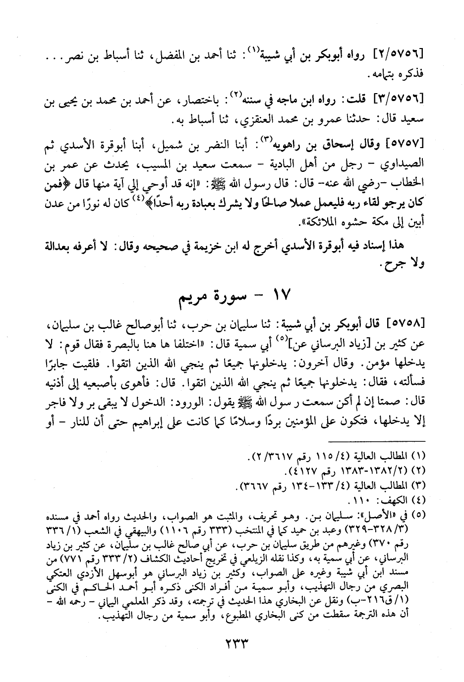 5757 - وَقَالَ إِسْحَاقُ بن راهويه: أبنا النضر بن شميل، أبنا أَبُو قُرَّةَ الْأَسَدِيُّ ثُمَّ الصَّيْدَاوِيُّ- رَجُلٌ مِنْ أَهْلِ الْبَادِيَةِ- سَمِعْتُ سَعِيدَ بْنَ الْمُسَيِّبِ، يُحَدِّثُ عَنْ عُمَرَ بْنِ الْخَطَّابِ- رَضِيَ اللَّهُ عَنْهُ- قَالَ: قَالَ رَسُولُ اللَّهِ - صَلَّى اللَّهُ عَلَيْهِ وَسَلَّمَ -: "إِنَّهُ قَدْ أُوحِيَ إِلَيَّ آيَةً مِنْهَا قَالَ (فَمَنْ كَانَ يَرْجُو لِقَاءَ رَبِّهِ فَلْيَعْمَلْ عَمَلا صَالِحًا وَلا يُشْرِكْ بِعِبَادَةِ رَبِّهِ أَحَدًا) كَانَ لَهُ نُورٌا مِنْ عَدْنٍ أبين إِلَى مَكَّةَ حَشْوُهُ الْمَلَائِكَةُ".