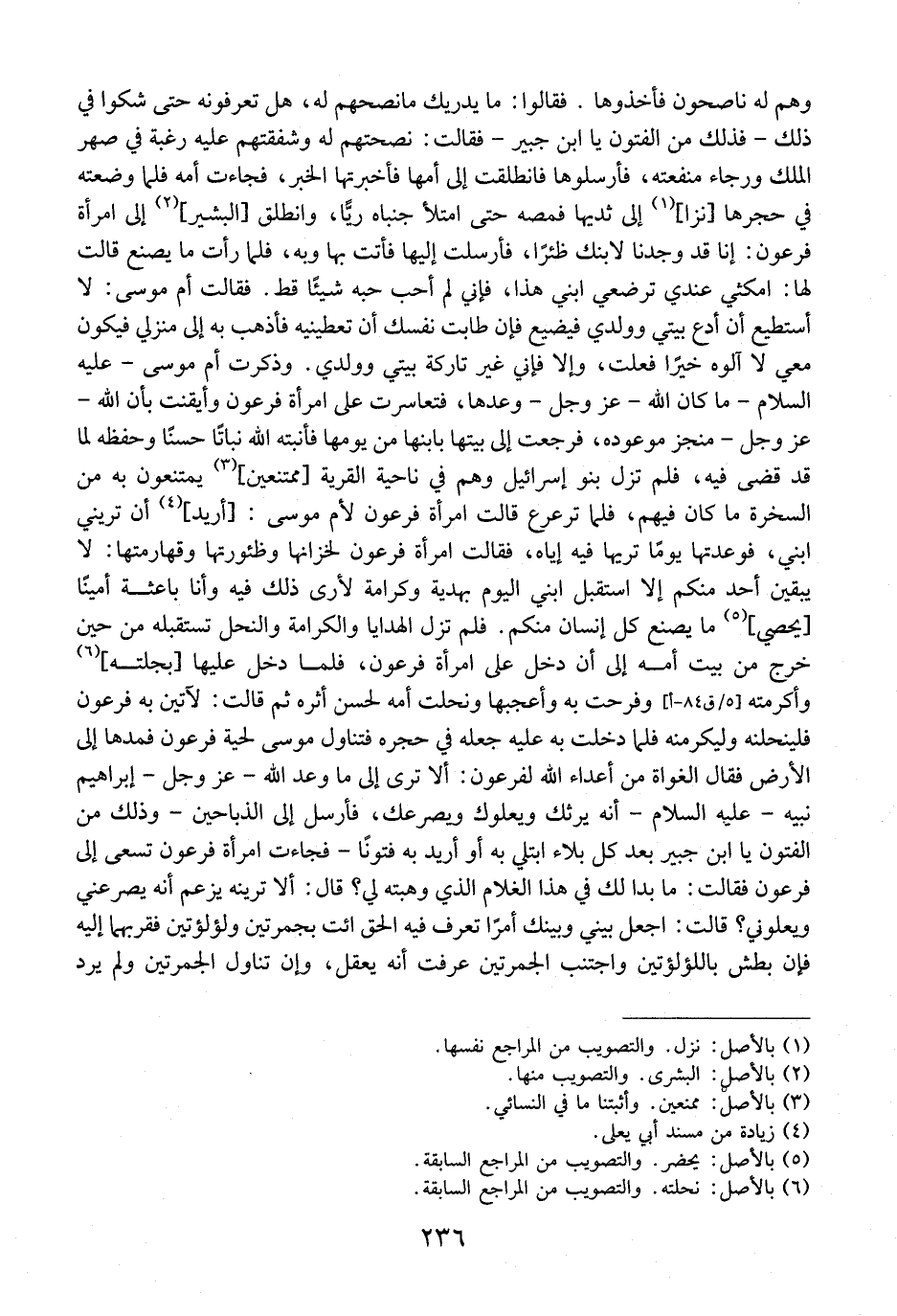 القرية ممتنعين، يَمْتَنِعُونَ بِهِ مِنَ السُّخْرَةِ مَا كَانَ فِيهِمْ، فَلَمَّا تَرَعْرَعَ قَالَتِ امْرَأَةُ فِرْعَوْنَ لِأُمِّ مُوسَى: أريد أَنْ تُرِينِي ابْنِي، فَوَعَدَتْهَا يَوْمًا تُرِيهَا فِيهِ إِيَّاهُ، فَقَالَتِ امْرَأَةُ فِرْعَوْنَ لِخُزَّانِهَا وَظُئُورَتِهَا وَقَهَارَمَتِهَا: لَا يَبْقَيَنَّ أَحَدٌ مِنْكُمْ إِلَّا اسْتَقْبَلَ ابْنِي الْيَوْمَ بِهَدِيَّةٍ وَكَرَامَةٍ لِأَرَى ذَلِكَ فِيهِ وَأَنَا باعثة أميناً يحصي مَا يَصْنَعُ كُلُّ إِنْسَانٍ مِنْكُمْ. فَلَمْ تَزَلِ الهدايا والكرامة والنحل تَسْتَقْبِلُهُ مِنْ حِينِ خَرَجَ مِنْ بَيْتِ أُمِّهِ إِلَى أَنْ دَخَلَ عَلَى امْرَأَةِ فِرْعَوْنَ، فَلَمَّا دخل عليها بجلته، وَأَكْرَمَتْهُ وَفَرِحَتْ بِهِ وَأَعْجَبَهَا وَنَحَلَتْ أُمَّهُ لِحُسْنِ أَثَرِهِ ثُمَّ قَالَتْ: لَآتِيَنَّ بِهِ فِرْعَوْنَ فَلَيَنْحِلَنَّهُ وَلَيُكْرِمَنَّهُ فَلَمَّا دَخَلَتْ بِهِ عَلَيْهِ جَعَلَهُ فِي حِجْرِهِ فَتَنَاوَلَ مُوسَى لِحْيَةَ فِرْعَوْنَ فَمَدَّهَا إِلَى الْأَرْضِ فَقَالَ الْغُوَاةُ مِنْ أَعْدَاءُ اللَّهِ لِفِرْعَوْنَ: أَلَا تَرَى إِلَى مَا وَعَدَ اللَّهُ- عَزَّ وَجَلَّ- إِبْرَاهِيمَ نَبِيَّهُ- عَلَيْهِ السَّلَامُ- أَنَّهُ يَرِثُكَ وَيَعْلُوكَ وَيَصْرَعُكَ، فَأَرْسِلْ إِلَى الذَّبَّاحِينَ- وَذَلِكَ مِنَ الْفُتُونِ يَا ابْنَ جُبَيْرٍ بَعْدَ كُلِّ بَلَاءٍ ابْتُلِيَ بِهِ أَوْ أُرِيدَ بِهِ فُتُونًا- فَجَاءَتِ امْرَأَةُ فِرْعَوْنَ تَسْعَى إِلَى فِرْعَوْنَ فَقَالَتْ: مَا بَدَا لَكَ فِي هَذَا الْغُلَامِ الَّذِي وَهَبْتَهُ لِي؟ قَالَ: أَلَا تَرِينَهُ يَزْعُمُ أَنَّهُ يَصْرَعُنِي وَيَعْلُونِي؟ قَالَتْ: أَجْعَلُ بَيْنِي وَبَيْنَكَ أَمْرًا تَعْرِفُ فِيهِ الْحَقَّ ائْتِ بِجَمْرَتَيْنِ وَلُؤْلُؤَتَيْنِ فَقَرِّبْهُمَا إِلَيْهِ فإن بطش بِاللُّؤْلُؤَتَيْنِ وَاجْتَنَبَ الْجَمْرَتَيْنِ عَرَفْتَ أَنَّهُ يَعْقِلُ، وَإِنْ تَنَاوَلَ الْجَمْرَتَيْنِ وَلَمْ يَرِدِ