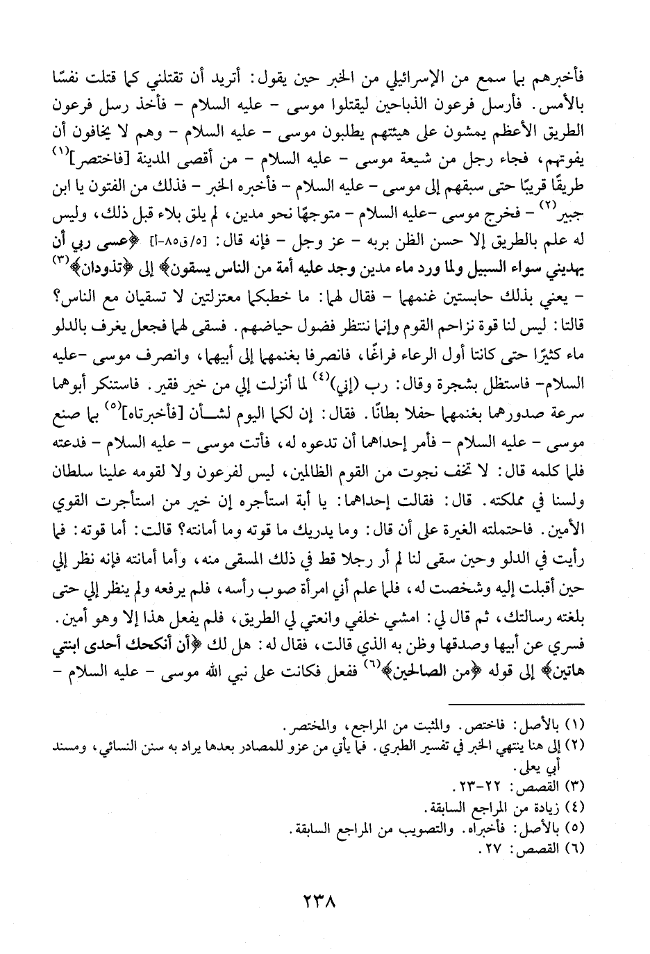 فَأَخْبَرَهُمْ بِمَا سَمِعَ مِنَ الْإِسْرَائِيلِيِّ مِنَ الْخَبَرِ حِينَ يَقُولُ: أَتُرِيدُ أَنْ تَقْتُلَنِي كَمَا قَتَلْتَ نَفْسًا بِالْأَمْسِ. فَأَرْسَلَ فِرْعَوْنُ الذَّبَّاحِينَ لِيَقْتُلُوا مُوسَى- عَلَيْهِ السَّلَامُ- فَأَخَذَ رُسُلُ فِرْعَوْنَ الطَّرِيقَ الْأَعْظَمَ يمشون على هيئتهم يَطْلُبُونَ مُوسَى- عَلَيْهِ السَّلَامُ- وَهُمْ لَا يَخَافُونَ أَنْ يَفُوتَهُمْ، فَجَاءَ رَجُلٌ مِنْ شِيعَةِ مُوسَى- عَلَيْهِ السَّلَامُ- مِنْ أَقْصَى الْمَدِينَةِ فَاخْتَصَرَ، طَرِيقًا قَرِيبًا حَتَّى سَبَقَهُمْ إِلَى مُوسَى- عَلَيْهِ السَّلَامُ- فأخبره الخبر- فَذَلِكَ مِنَ الْفُتُونِ يَا ابْنَ جُبَيْرٍ - فَخَرَجَ مُوسَى- عَلَيْهِ السَّلَامُ- مُتَوَجِّهًا نَحْوَ مَدْيَنَ لَمْ يَلْقَ بَلَاءً قَبْلَ ذَلِكَ، وَلَيْسَ لَهُ عِلْمٌ بِالطَّرِيقِ إِلَّا حُسْنُ الظَّنِّ بِرَبِّهِ- عَزَّ وَجَلَّ- فَإِنَّهُ قَالَ: (عَسَى رَبِّي أَنْ يَهْدِيَنِي سَوَاءَ السبيل وَلَمَّا وَرَدَ مَاءَ مَدْيَنَ وَجَدَ عَلَيْهِ أُمَّةً من الناس يسقون) إلى تذودان - يعني بذلك حابستين غنمهما- فقال لهما: ما خطبكما مُعْتَزِلَتَيْنِ لَا تَسْقِيَانِ مَعَ النَّاسِ؟ قَالَتَا: لَيْسَ لَنَا قُوَّةٌ نُزَاحِمُ الْقَوْمَ وَإِنَّمَا نَنْتَظِرُ فُضُولَ حياضهم. فسقى لهما فَجَعَلَ يَغْرِفُ بِالدَّلْوِ مَاءً كَثِيرًا حَتَّى كَانَتَا أول الرعاء فراغاً، فانصرفا بِغَنَمِهِمَا إِلَى أَبِيهِمَا، وَانْصَرَفَ مُوسَى- عَلَيْهِ السَّلَامُ- فَاسْتَظَلَّ بِشَجَرَةٍ وَقَالَ: (رَبِّ إِنِّي لِمَا أَنْزَلْتَ إلي من خير فقير) . فاستنكر أبوهما سرعة صدورهما بغنمهما حفلا بطاناً. فقال: إن لكما اليوم لشأن فأخبرتاه، بما صَنَعَ مُوسَى- عَلَيْهِ السَّلَامُ- فَأَمَرَ إِحْدَاهُمَا أَنْ تَدْعُوَهُ لَهُ، فَأَتَتْ مُوسَى- عَلَيْهِ السَّلَامُ-