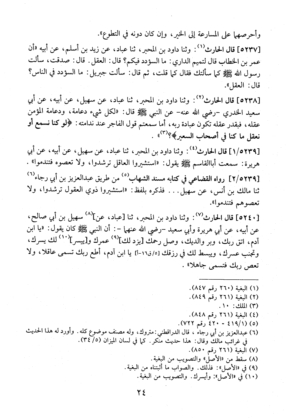5237 - قَالَ الْحَارِثُ: وَثَنَا دَاوُدُ بْنُ الْمُحَبَّرِ، ثَنَا عَبَّادٌ، عَنْ زَيْدِ بْنِ أَسْلَمَ، عَنْ أَبِيهِ "أَنَّ عُمَرَ بْنَ الْخَطَّابِ قَالَ لِتَمِيمٍ الدَّارِيِّ: مَا السُّؤْدُدُ فِيكُمْ؟ قَالَ: الْعَقْلُ. قَالَ: صَدَقْتَ، سَأَلْتُ رَسُولَ اللَّهِ - صَلَّى اللَّهُ عَلَيْهِ وَسَلَّمَ - كَمَا سَأَلْتُكَ فَقَالَ كَمَا قُلْتَ، ثُمَّ قَالَ: سَأَلْتُ جِبْرِيلَ: مَا السُّؤْدُدُ فِي النَّاسِ؟ قَالَ: الْعَقْلُ".