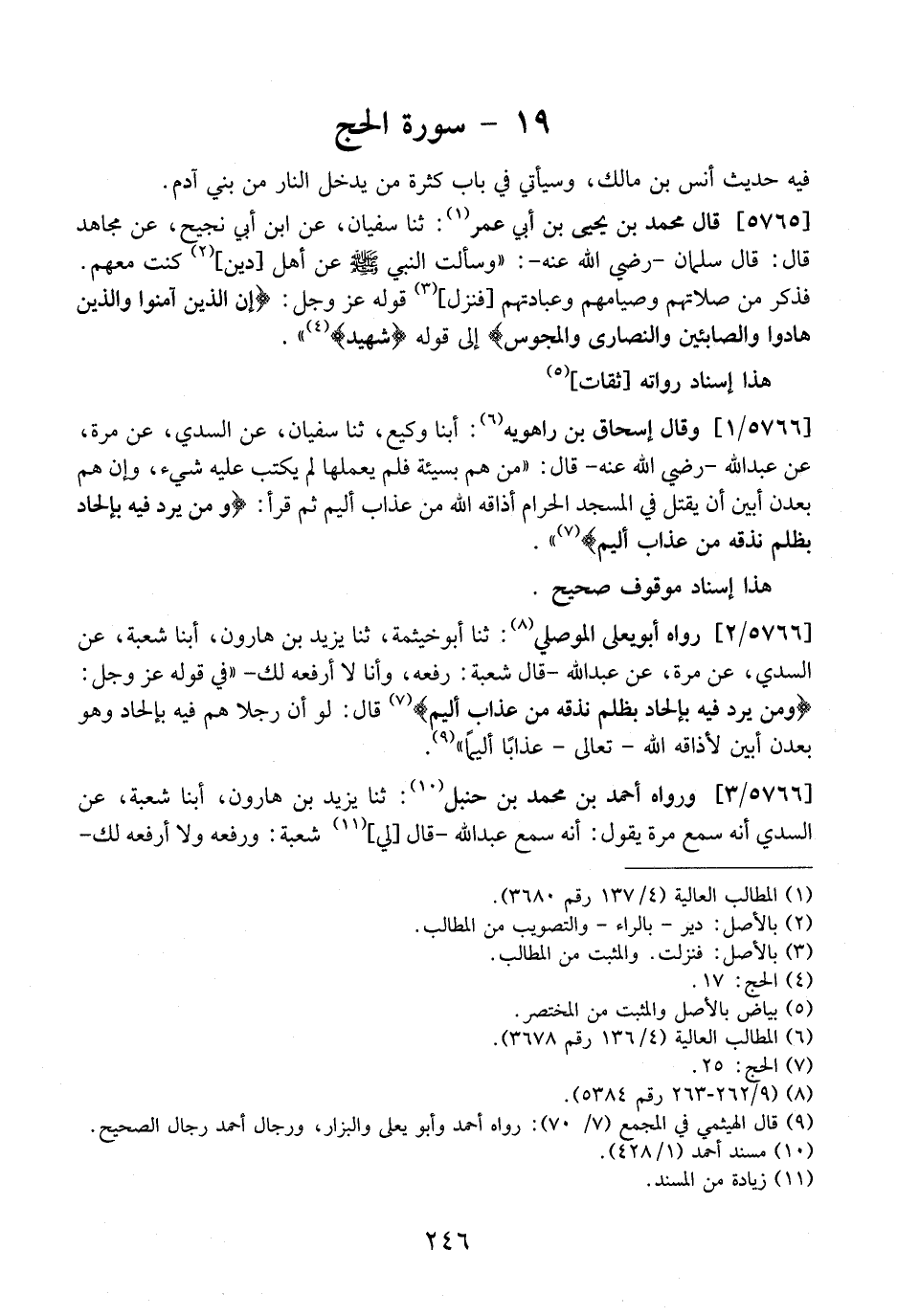 5766 / 2 - رَوَاهُ أَبُو يَعْلَى الْمُوصِلِيُّ: ثَنَا أَبُو خَيْثَمَةَ، ثَنَا يَزِيدُ بْنُ هارون، أبنا شُعْبَةُ، عَنِ السُّدِّيِّ، عَنْ مُرَّةَ، عَنْ عَبْدِ اللَّهِ- قَالَ شُعْبَةُ: رَفَعَهُ وَأَنَا لَا أَرْفَعُهُ لَكَ- "فِي قَوْلِهِ عَزَّ وَجَلَّ: (وَمَنْ يُرِدْ فِيهِ بِإِلْحَادٍ بِظُلْمٍ نُذِقْهُ مِنْ عَذَابٍ أَلِيمٍ) قَالَ: لَوْ أَنَّ رَجُلًا هَمَّ فِيهِ بِإِلْحَادٍ وهو بعدن أَبْيَنُ لَأَذَاقَهُ اللَّهُ- تَعَالَى- عَذَابًا أَلِيمًا".