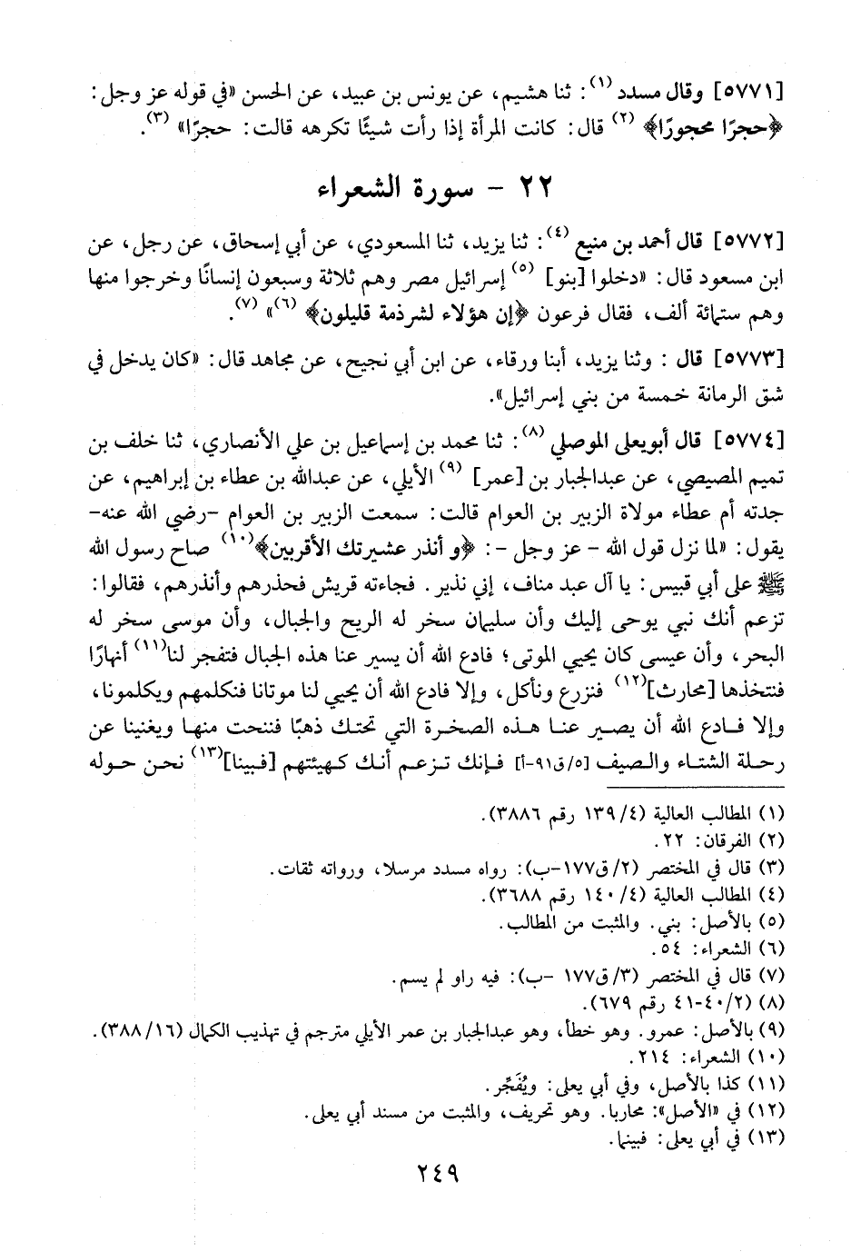 5772 - قَالَ أَحْمَدُ بْنُ مَنِيعٍ: ثَنَا يَزِيدُ، ثَنَا الْمَسْعُودِيُّ، عَنْ أَبِي إسحاق، عن رجل، عن ابن مسعود قال: "دَخَلُوا بَنُو إِسْرَائِيلَ مِصْرَ وَهُمْ ثَلَاثَةٌ وَسَبْعُونَ إنساناً وخرجوا منها وهم ستمائة ألف، فقال فرعون فإن هؤلاء لشرذمة قليلون؟ ".