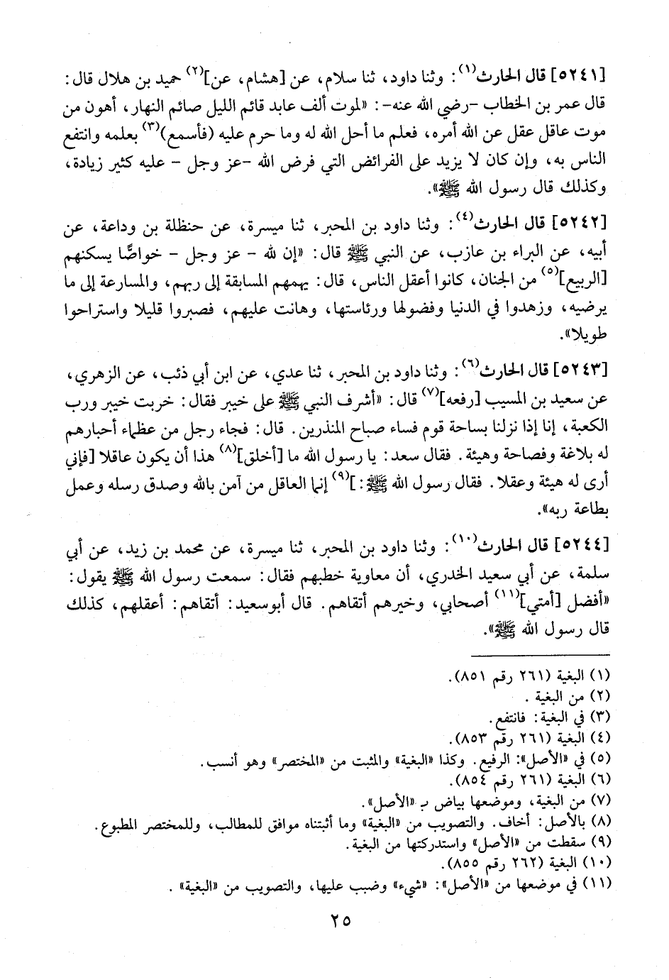 5241 - قَالَ الْحَارِثُ: وَثَنَا دَاوُدُ، ثَنَا سَلَّامٌ، عَنْ هشام، عن حميد بن هلال قَالَ: قَالَ عُمَرُ بْنُ الْخَطَّابِ- رَضِيَ اللَّهُ عَنْهُ-: "لَمَوْتُ أَلْفِ عَابِدٍ قَائِمِ اللَّيْلِ صَائِمِ النَّهَارِ، أَهْوَنُ مِنْ مَوْتِ عَاقِلٍ عَقَلَ عَنِ اللَّهِ أَمْرَهُ، فَعَلِمَ مَا أَحَلَّ اللَّهُ لَهُ وَمَا حَرَّمَ عَلَيْهِ (فَأَسْمَعَ) بِعِلْمِهِ وَانْتَفَعَ النَّاسُ بِهِ، وَإِنْ كَانَ لَا يَزِيدُ عَلَى الْفَرَائِضِ الَّتِي فَرَضَ اللَّهُ- عَزَّ وَجَلَّ- عَلَيْهِ كَثِيرَ زِيَادَةٍ، وَكَذَلِكَ قَالَ رَسُولُ اللَّهِ - صَلَّى اللَّهُ عَلَيْهِ وَسَلَّمَ -) .