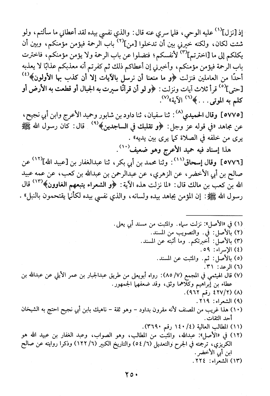 5776 - وقال إِسْحَاقُ: وَثَنَا مُحَمَّدُ بْنُ أَبِي بَكْرٍ، ثَنَا عَبْدُ الْغَفَّارِ بْنُ عُبَيْدِ اللَّهِ، عَنْ صَالِحُ بْنُ أَبِي الْأَخْضَرِ، عَنِ الزُّهْرِيِّ، عَنْ عَبْدِ الرَّحْمَنِ بْنِ عَبْدِ الله بْنِ كَعْبٍ، عَنْ عَمِّهِ عُبَيْدِ اللَّهِ بْنِ كَعْبِ بْنِ مَالِكٍ قَالَ: "لَمَّا نَزَلَتْ هَذِهِ الآية: (والشعراء يتبعهم الغاوون) قال رسول الله - صلى الله عليه وسلم -: إِنَّ الْمُؤْمِنَ يُجَاهِدُ بِيَدِهِ وَلِسَانِهِ، وَالَّذِي نَفْسِي بيده لكأنما يقتحمون بالنبل".