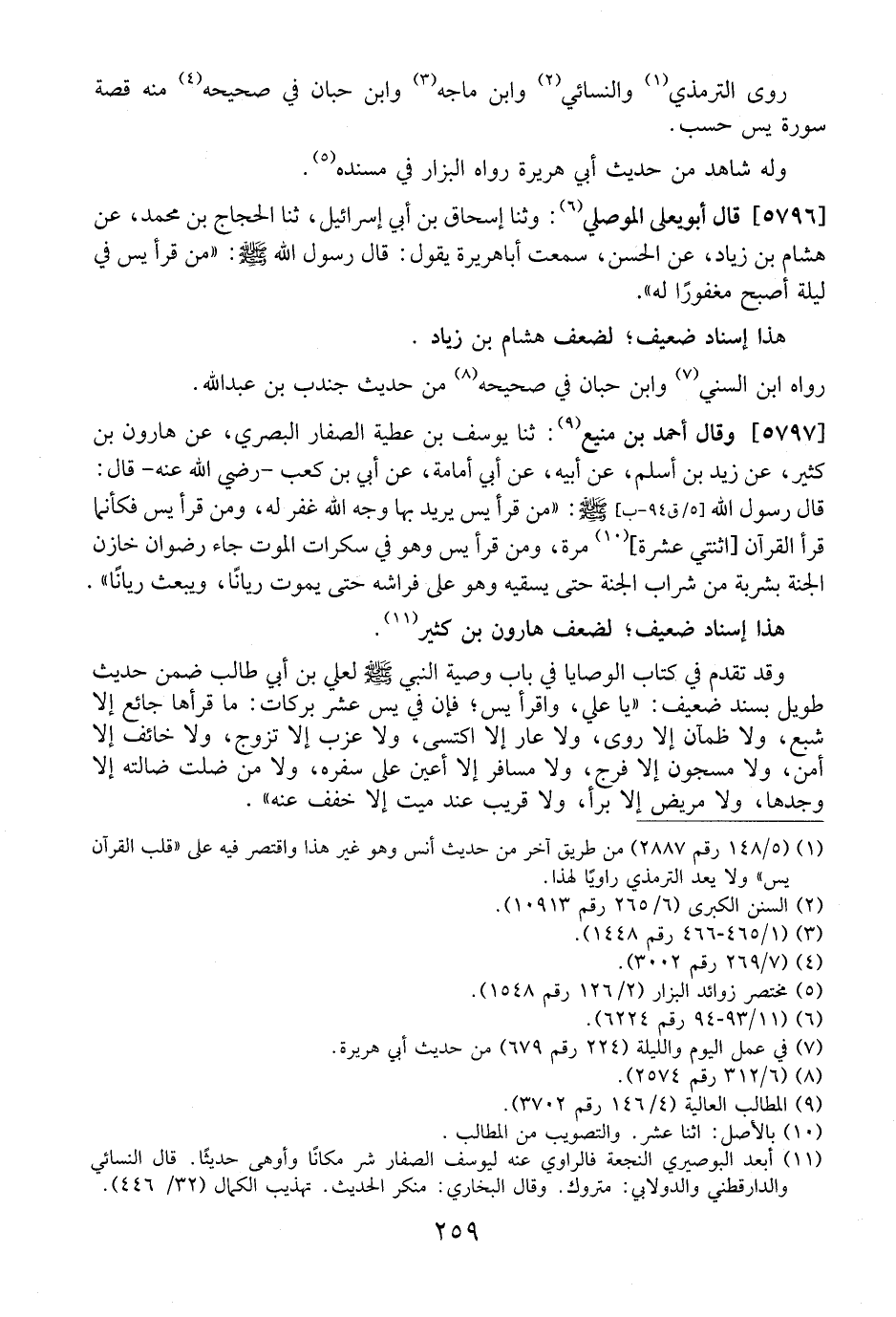 5797 - وَقَالَ أَحْمَدُ بْنُ مَنِيعٍ: ثَنَا يُوسُفُ بْنُ عَطِيَّةَ الصفار البصري، عَنْ هَارُونَ بْنِ كَثِيرٍ، عَنْ زَيْدِ بْنِ أَسْلَمَ، عَنْ أَبِيهِ، عَنْ أبي أمامة، عَنْ أُبَيِّ بْنِ كَعْبٍ- رَضِيَ اللَّهُ عَنْهُ- قَالَ: قَالَ رَسُولُ اللَّهِ - صَلَّى اللَّهُ عَلَيْهِ وسلم -: "مَنْ قَرَأَ يَسْ يُرِيدُ بِهَا وَجْهَ اللَّهِ غُفِرَ لَهُ، وَمَنْ قَرَأَ يَسْ فَكَأَنَّمَا قَرَأَ الْقُرْآنَ اثْنَتَيْ عَشْرَةَ مَرَّةً، وَمَنْ قَرَأَ يَسْ وَهُوَ فِي سَكَرَاتِ الْمَوْتِ جَاءَ رِضْوَانُ خَازِنُ الْجَنَّةِ بِشَرْبَةٍ مِنْ شَرَابِ الْجَنَّةِ حَتَّى يَسْقِيَهُ وهو على فراشه حتى يموت رياناً، ويبعث رياناً". هذا إسناد ضعيف، لضعف هارون بن كثير.