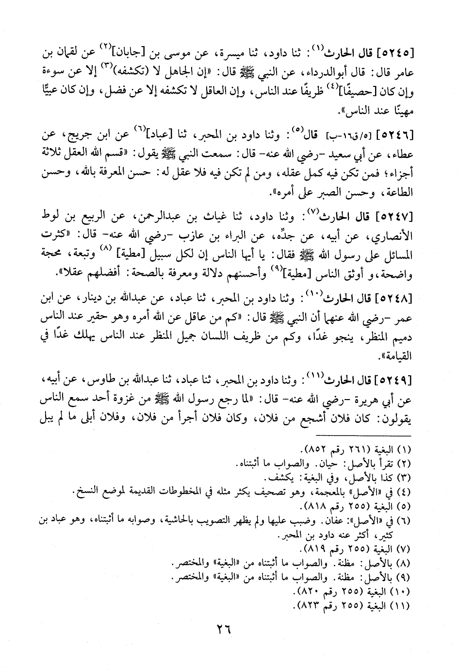5245 - قَالَ الْحَارِثُ: ثَنَا دَاوُدُ، ثَنَا مَيْسَرَةُ، عَنْ مُوسَى بْنِ جَابَانَ- عَنْ لُقْمَانَ بْنِ عَامِرٍ قال: قَالَ أَبُو الدَّرْدَاءِ، عَنِ النَّبِيِّ - صَلَّى اللَّهُ عَلَيْهِ وَسَلَّمَ - قَالَ: "إن الجاهل لا (تكشفه) إِلَّا عَنْ سَوْءَةٍ وَإِنْ كَانَ حَصِيفًا، ظَرِيفًا عند الناس، وإن العاقل لا تكشفه إِلَّا عَنْ فَضْلٍ، وَإِنْ كَانَ عَيِيًّا مَهِينًا عِنْدَ النَّاسِ".