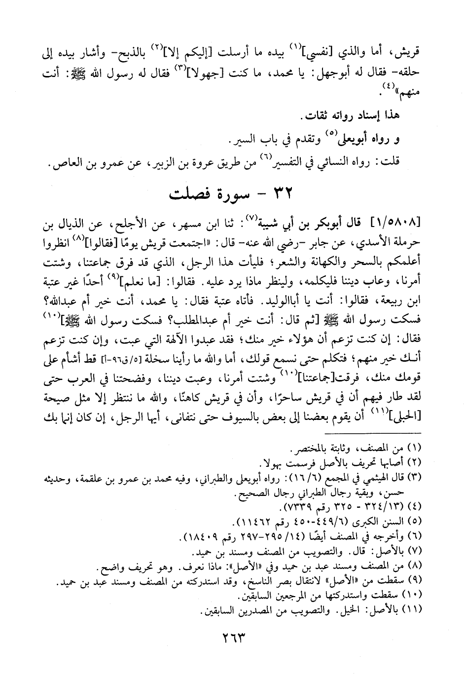 5808 / 1 - قَالَ أَبُو بَكْرِ بْنُ أَبِي شَيْبَةَ: ثَنَا ابْنُ مُسْهِرٍ، عَنِ الْأَجْلَحِ، عَنِ الذَّيَّالِ بْنِ حَرْمَلَةَ الْأَسَدِيِّ، عَنْ جَابِرٍ- رَضِيَ الله عنه- قال: "اجتمعت قريش يوماً فقالوا انظروا أعلمكم بالسحر والكهانة والشعر" فليأت هَذَا الرَّجُلَ، الَّذِي قَدْ فَرَّقَ جَمَاعَتَنَا، وَشَتَّتَ أمرنا، وعاب ديننا فليكلمه، ولينظر ماذا يرد عليه. فقالوا: ما نعلم أحداً غير عتبة بن ربيعة، فقالوا: أنت يَا أَبَا الْوَلِيدِ. فَأَتَاهُ عُتْبَةُ فَقَالَ: يَا مُحَمَّدُ، أَنْتَ خَيْرٌ أَمْ عَبْدُ اللَّهِ؟ فَسَكَتَ رَسُولُ اللَّهِ - صَلَّى اللَّهُ عَلَيْهِ وَسَلَّمَ - ثُمَّ قال: أنت خير أم عبد المطلب؟ فَسَكَتَ رَسُولُ اللَّهِ - صَلَّى اللَّهُ عَلَيْهِ وَسَلَّمَ -، فَقَالَ: إِنْ كُنْتَ تَزْعُمُ أَنَّ هَؤُلَاءِ خَيْرٌ منك؟ فَقَدْ عَبَدُوا الْآلِهَةَ الَّتِي عِبْتَ، وَإِنْ كُنْتَ تَزْعُمُ أَنَّكَ خَيْرٌ مِنْهُمْ" فَتَكَلَّمْ حَتَّى نَسْمَعَ قولك، أما والله مَا رَأَيْنَا سَخْلَةً قَطُّ أَشْأَمَ عَلَى قَوْمِكَ مِنْكَ، فَرَّقْتَ جَمَاعَتَنَا، وَشَتَّْتَ أَمْرَنَا، وَعِبْتَ دِينَنَا، وَفَضْحَتَنَا فِي الْعَرَبِ حَتَّى لَقَدْ طَارَ فِيهِمْ أَنَّ فِي قُرَيْشٍ سَاحِرًا، وَأَنَّ فِي قُرَيْشٍ كاهناً، والله ما ننتظر إلا مثل صيحة الحبلى، أَنْ يَقُومَ بَعْضُنَا إِلَى بَعْضٍ بِالسُّيُوفِ حَتَّى نتفانى، أيها الرجل، إن كان إنما بك