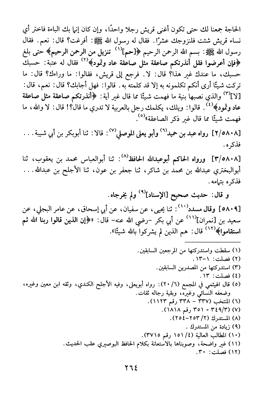 الحاجة جَمَعْنَا لَكَ حَتَّى تَكُونَ أَغْنَى قُرَيْشٍ رَجُلًا واحداً، وإن كان إنما بك الباءة فَاخْتَرْ أَيَّ نِسَاءِ قُرَيْشٍ شِئْتَ فَلْنُزَوِّجْكَ عَشْرًا. فَقَالَ لَهُ رَسُولُ اللَّهِ - صَلَّى اللَّهُ عَلَيْهِ وسلم -: أفرغت؟ قَالَ: نَعَمْ. فَقَالَ رَسُولُ اللَّهِ - صَلَّى اللَّهُ عَلَيْهِ وَسَلَّمَ -: بسم الله الرحمن الرحيم (حم، تنزيل من الرحمن الرحيم) حَتَّى بَلَغَ (فَإِنْ أَعْرَضُوا فَقُلْ أَنْذَرْتُكُمْ صَاعِقَةً مثل صاعقة عاد وثمود) فقال له عتبة: حسبك حَسْبُكَ، مَا عِنْدَكَ غَيْرَ هَذَا؟ قَالَ: لَا. فَرَجَعَ إِلَى قُرَيْشٍ، فَقَالُوا: مَا وَرَاءَكَ؟ قَالَ: مَا تَرَكْتُ شَيْئًا أَرَى أَنَّكُمْ تُكَلِّمُونَهُ بِهِ إِلَّا قَدْ كَلَّمْتُهُ بِهِ. قَالُوا: فَهَلْ أَجَابَكَ؟ قال: نعم، قال: لا والذي نصبها بنية مَا فَهِمْتُ شَيْئًا مِمَّا قَالَ غَيْرَ آيَةِ: (أنذرتكم صاعقة مثل صاعقة عاد وثمود) . قَالُوا: وَيْلُكَ، يُكَلِّمُكَ رَجُلٌ بِالْعَرَبِيَّةِ لَا تَدْرِي ما قَالَ؟! قَالَ: لَا وَاللَّهِ، مَا فَهِمْتُ شَيْئًا مِمَّا قَالَ غَيْرَ ذِكْرِ الصَّاعِقَةِ".