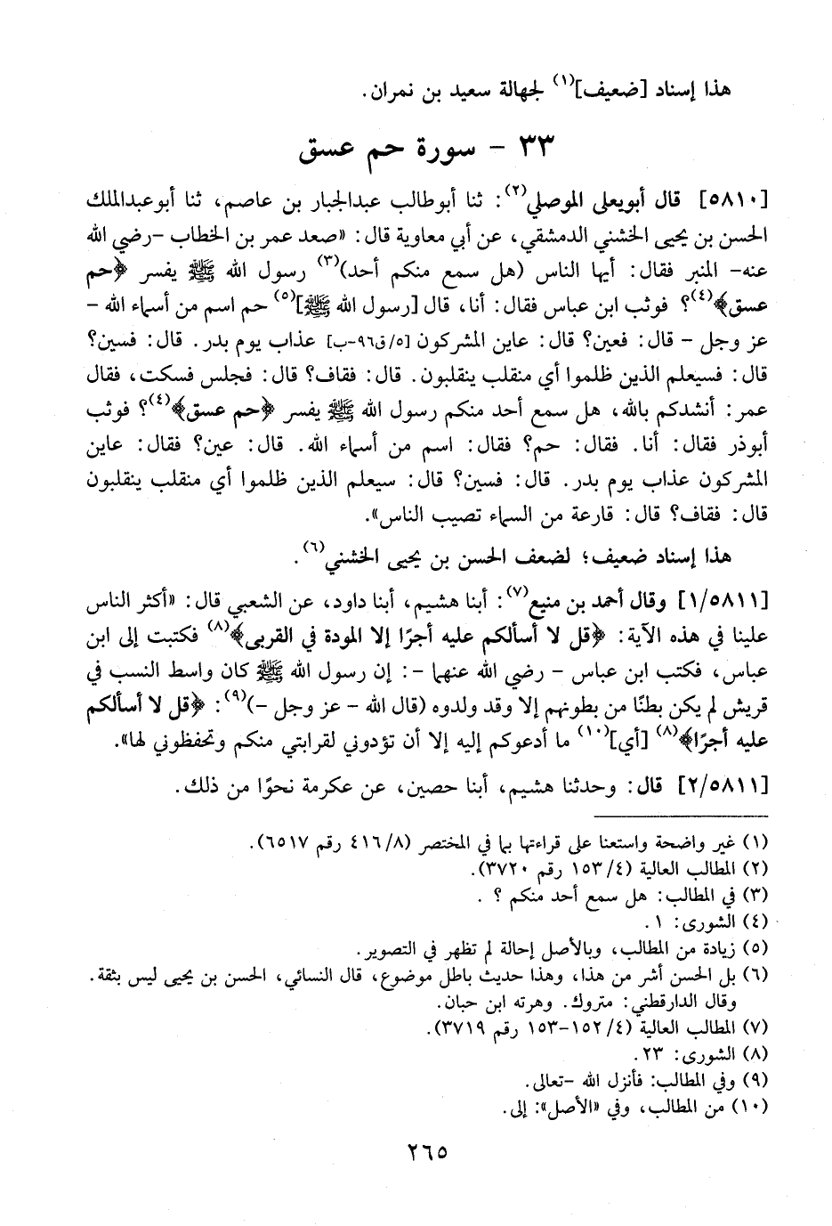 5810 - قَالَ أَبُو يَعْلَى الْمُوصِلِيُّ: ثَنَا أَبُو طَالِبٍ عَبْدُ الْجَبَّارِ بْنُ عَاصِمٍ، ثَنَا أَبُو عَبْدِ الْمَلَكِ الْحَسَنُ بْنُ يَحْيَى الْخُشَنِيُّ الدِّمَشْقِيُّ، عَنْ أَبِي مُعَاوِيَةَ قَالَ: "صَعِدَ عُمَرُ بْنُ الْخَطَّابِ- رَضِيَ اللَّهُ عَنْهُ- الْمِنْبَرَ فَقَالَ: أَيُّهَا النَّاسُ (هَلْ سَمِعَ مِنْكُمْ أَحَدٌ) رَسُولَ اللَّهِ - صَلَّى اللَّهُ عَلَيْهِ وَسَلَّمَ - يُفَسِّرُ (حَمْ عَسَقَ) ؟ فَوَثَبَ ابْنُ عَبَّاسٍ فَقَالَ: أَنَا، قَالَ رَسُولُ اللَّهِ - صَلَّى اللَّهُ عَلَيْهِ وسلم -، حَمْ اسْمٌ مِنْ أَسْمَاءِ اللَّهِ- عَزَّ وَجَلَّ- قَالَ: فَعَيْنٌ؟ قَالَ: عَايَنَ الْمُشْرِكُونَ عَذَابَ يَوْمِ بدر. قال: فسين؟ قال: فسيعلم الَّذِينَ ظَلَمُوا أَيَّ مُنْقَلَبٍ يَنْقَلِبُونَ. قَالَ: فَقَافٌ؟ قال: فَجَلَسَ فَسَكَتَ، فَقَالَ عُمَرُ: أَنْشِدُكُمْ بِاللَّهِ، هَلْ سَمِعَ أَحَدٌ مِنْكُمْ رَسُولَ اللَّهِ - صَلَّى اللَّهُ عَلَيْهِ وَسَلَّمَ - يُفَسِّرُ (حَمْ عَسَقَ) ؟ فَوَثَبَ أَبُو ذر فقال: أنا. فقال: حم؟ فقال: اسم من أسماء الله. قال: عين؟ فقال: عَايَنَ الْمُشْرِكُونَ عَذَابَ يَوْمِ بَدْرٍ. قَالَ: فَسِينٌ؟ قَالَ: سَيَعْلَمُ الَّذِينَ ظَلَمُوا أَيَّ مُنْقَلَبٍ يَنْقَلِبُونَ قَالَ: فَقَافٌ؟ قَالَ: قَارِعَةٌ مِنَ السَّمَاءِ تُصِيبُ النَّاسَ".