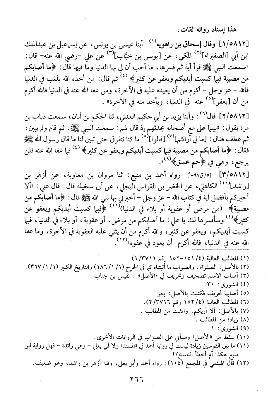 5812 / 1 - وَقَالَ إِسْحَاقُ بْنُ راهويه: أبنا عِيسَى بْنُ يُونُسَ، عَنْ إِسْمَاعِيلَ بْنِ عَبْدِ الملك ابن أبي الصفيراء الْمَكِّيِّ، عَنْ يُونُسَ بْنِ خبَّاب، عَنْ عَلِيٍّ- رَضِيَ اللَّهُ عَنْهُ- قَالَ: "سَمِعْتُ النَّبِيَّ - صَلَّى اللَّهُ عَلَيْهِ وَسَلَّمَ - قَرَأَ آيَةً ثُمَّ فَسَّرَهَا، مَا أُحِبُّ أَنَّ لِي بِهَا الدُّنْيَا وَمَا فيها قال: (ما أَصَابَكُمْ مِنْ مُصِيبَةٍ فَبِمَا كَسَبَتْ أَيْدِيكُمْ وَيَعْفُو عن كثير) ثُمَّ قَالَ: مَنْ أَخَذَهُ اللَّهُ بِذَنْبٍ فِي الدُّنْيَا فَاللَّهُ- عَزَّ وَجَلَّ- أَكْرَمُ مِنْ أَنْ يُعِيدَهُ عَلَيْهِ فِي الْآخِرَةِ، وَمَنْ عَفَا اللَّهُ عَنْهُ فِي الدُّنْيَا فَاللَّهُ أَكْرَمُ مِنْ أَنْ يَعْفُوَ عَنْهُ فِي الدُّنْيَا، وَيَأْخُذَ مِنْهُ فِي الآخرة".
