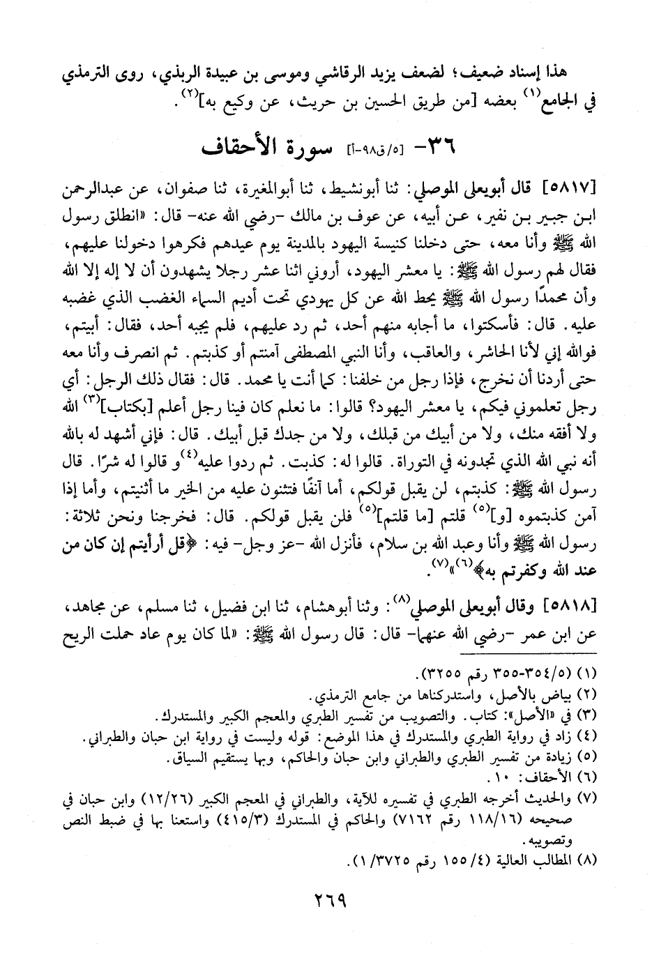 5817 - قَالَ أَبُو يَعْلَى الْمُوصِلِيُّ: ثَنَا أَبُو نَشِيطٍ، ثَنَا أَبُو الْمُغِيرَةِ، ثَنَا صَفْوَانُ، عَنْ عَبْدِ الرَّحْمَنِ بْنِ جُبَيْرِ بْنِ نُفَيْرٍ عَنْ أَبِيهِ، عَنْ عَوْفِ بْنِ مَالِكٍ- رَضِيَ اللَّهُ عَنْهُ- قَالَ: "انْطَلَقَ رَسُولُ اللَّهِ - صَلَّى اللَّهُ عَلَيْهِ وَسَلَّمَ - وَأَنَا مَعَهُ، حَتَّى دَخَلْنَا كَنِيسَةَ الْيَهُودِ بِالْمَدِينَةِ يَوْمَ عِيدِهِمْ فَكَرِهُوا دُخُولَنَا عليهم، فَقَالَ لَهُمْ رَسُولُ اللَّهِ - صَلَّى اللَّهُ عَلَيْهِ وَسَلَّمَ -: يَا مَعْشَرَ الْيَهُودِ، أَرُونِي اثْنَا عَشَرَ رَجُلًا يَشْهَدُونَ أَنْ لَا إِلَهَ إِلَّا اللَّهُ وَأَنَّ مُحَمَّدًا رَسُولُ اللَّهِ - صَلَّى اللَّهُ عَلَيْهِ وَسَلَّمَ - يَحُطُّ الله عن كل يهودي تحت أديم السَّمَاءِ الْغَضَبَ الَّذِي غَضِبَهُ عليه. قال: فأسكتوا، ما أجابه منهم أحد، ثم رد عليهم، فلم يجبه أحد، فقال: أبيتم، فو الله إِنِّي لَأَنَا الْحَاشِرُ، وَالْعَاقِبُ، وَأَنَا النَّبِيُّ الْمُصْطَفَى آمَنْتُمْ أَوْ كَذَّبْتُمْ. ثُمَّ انْصَرَفَ وَأَنَا مَعَهُ حَتَّى أَرَدْنَا أَنْ نَخْرُجَ، فَإِذَا رَجُلٌ مِنْ خَلْفِنَا: كَمَا أَنْتَ يَا مُحَمَّدُ. قَالَ: فَقَالَ ذلك الرجل: أي رجل تعلموني فِيكُمْ، يَا مَعْشَرَ الْيَهُودِ؟ قَالُوا: مَا نَعْلَمُ كَانَ فِينَا رَجُلٌ أَعْلَمُ بِكِتَابِ اللَّهِ وَلَا أفقه منك، ولا من أبيك من قبلك، وَلَا مِنْ جَدِّكَ قَبْلَ أَبِيكَ. قَالَ: فَإِنِّي أَشْهَدُ لَهُ بِاللَّهِ أَنَّهُ نَبِيُّ اللَّهِ الَّذِي تجدونه فِي التَّوْرَاةِ. قَالُوا لَهُ: كَذَبْتَ. ثُمَّ رَدُّوا عَلَيْهِ وَقَالُوا لَهُ شَرًّا. قَالَ رَسُولُ اللَّهِ - صَلَّى اللَّهُ عَلَيْهِ وَسَلَّمَ -: كَذَبْتُمْ، لَنْ يُقْبَلَ قولكم، أما آنفاً فَتُثْنُونَ عَلَيْهِ مِنَ الْخَيْرِ مَا أَثْنَيْتُمْ، وَأَمَّا إذا آمن كذبتموه وقلتم - ما قُلْتُمْ، فَلَنْ يُقْبَلَ قَوْلُكُمْ. قَالَ: فَخَرَجْنَا وَنَحْنُ ثَلَاثَةٌ: رَسُولُ اللَّهِ - صَلَّى اللَّهُ عَلَيْهِ وَسَلَّمَ - وَأَنَا وَعَبْدُ اللَّهِ بْنُ سَلَامٍ، فَأَنْزَلَ اللَّهُ- عَزَّ وَجَلَّ- فِيهِ: (قُلْ أَرَأَيْتُمْ إِنْ كَانَ مِنْ عِنْدِ اللَّهِ وكفرتم به) .