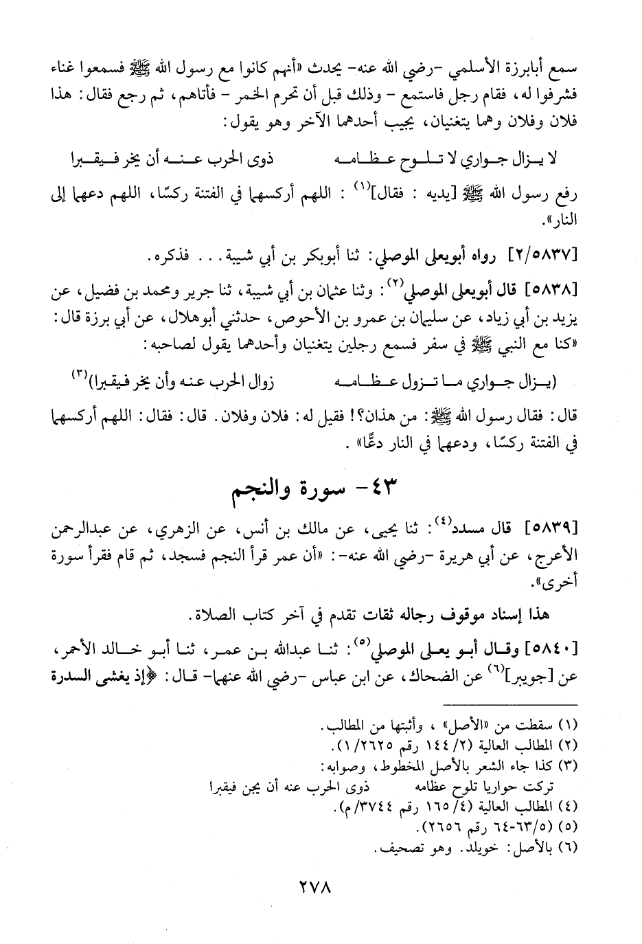 5838 - قَالَ أَبُو يَعْلَى الْمَوْصِلِيُّ: وَثَنَا عُثْمَانُ بْنُ أَبِي شَيْبَةَ، ثَنَا جَرِيرٌ وَمُحَمَّدُ بْنُ فُضَيْلٍ، عَنْ يَزِيدَ بْنِ أَبِي زِيَادٍ، عَنْ سُلَيْمَانَ بْنِ عَمْرِو بْنِ الْأَحْوَصِ، حَدَّثَنِي أَبُو هِلَالٍ، عَنْ أَبِي بَرْزَةَ قَالَ: "كُنَّا مَعَ النَّبِيِّ - صَلَّى اللَّهُ عَلَيْهِ وَسَلَّمَ - فِي سَفَرٍ فَسَمِعَ رَجُلَيْنِ يَتَغَنَّيَانِ وَأَحَدُهُمَا يَقُولُ لِصَاحِبِهِ: