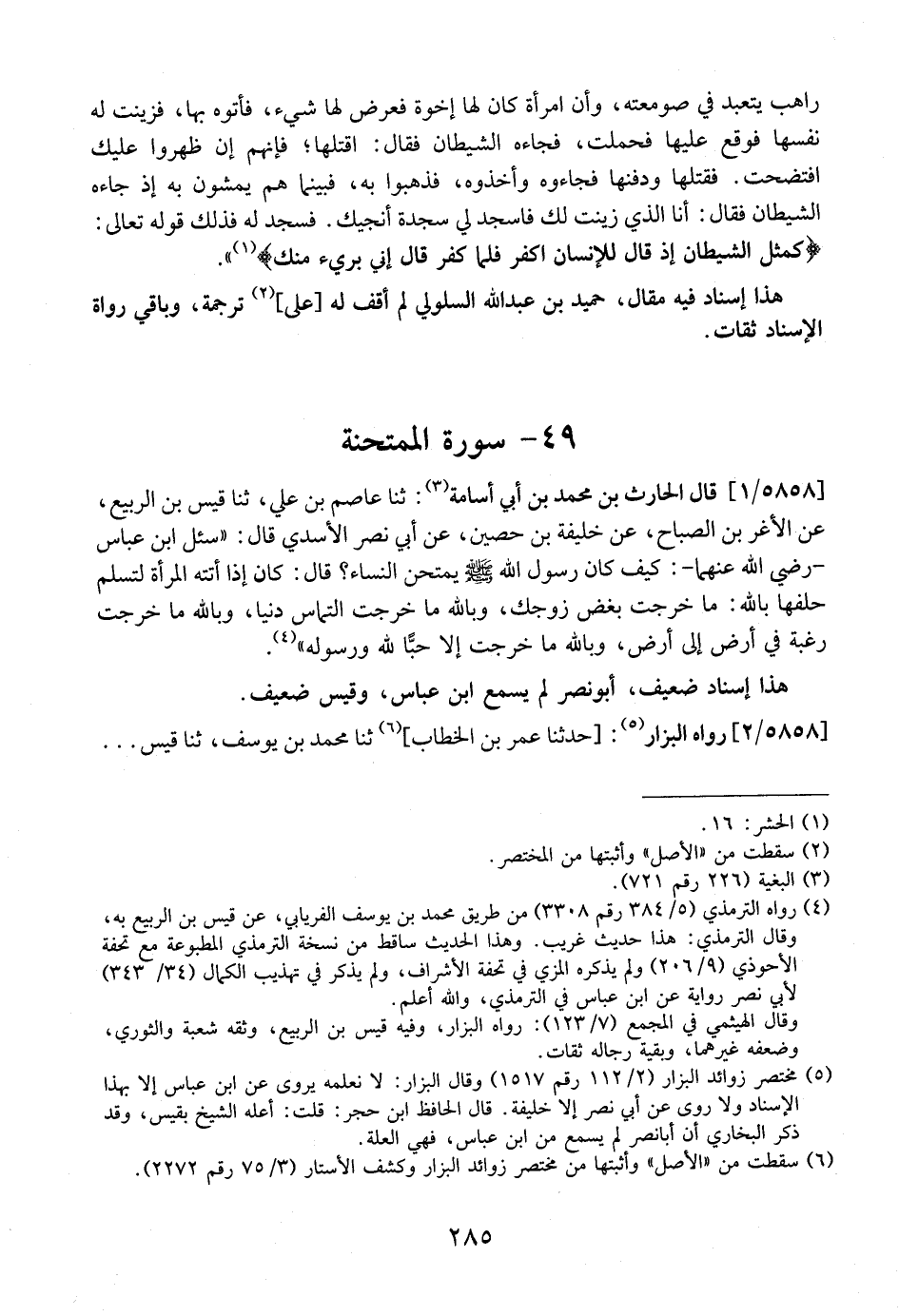5858 / 1 - قَالَ الْحَارِثُ بْنُ مُحَمَّدِ بْنِ أَبِي أُسَامَةَ: ثَنَا عَاصِمُ بْنُ عَلِيٍّ، ثَنَا قَيْسُ بْنُ الرَّبِيعِ، عَنِ الْأَغَرِّ بْنِ الصَّبَّاحِ، عَنْ خَلِيفَةَ بْنِ حُصَيْنٍ، عَنْ أَبِي نَصْرٍ الْأَسَدِيِّ قَالَ: "سُئِلَ ابْنُ عَبَّاسٍ - رَضِيَ اللَّهُ عَنْهُمَا-: كَيْفَ كَانَ رَسُولُ اللَّهِ - صَلَّى اللَّهُ عَلَيْهِ وَسَلَّمَ - يَمْتَحِنُ النِّسَاءَ؟ قَالَ: كَانَ إِذَا أَتَتْهُ الْمَرْأَةُ لِتُسْلِمَ حَلَّفَهَا بِاللَّهِ: مَا خَرَجْتِ بُغْضَ زَوْجِكِ، وَبِاللَّهِ مَا خَرَجْتِ الْتِمَاسَ دُنْيَا، وَبِاللَّهِ مَا خرجت رغبة في أرض إِلَى أَرْضٍ، وَبِاللَّهِ مَا خَرَجْتِ إِلَّا حُبًّا لِلَّهِ وَرَسُولِهِ".