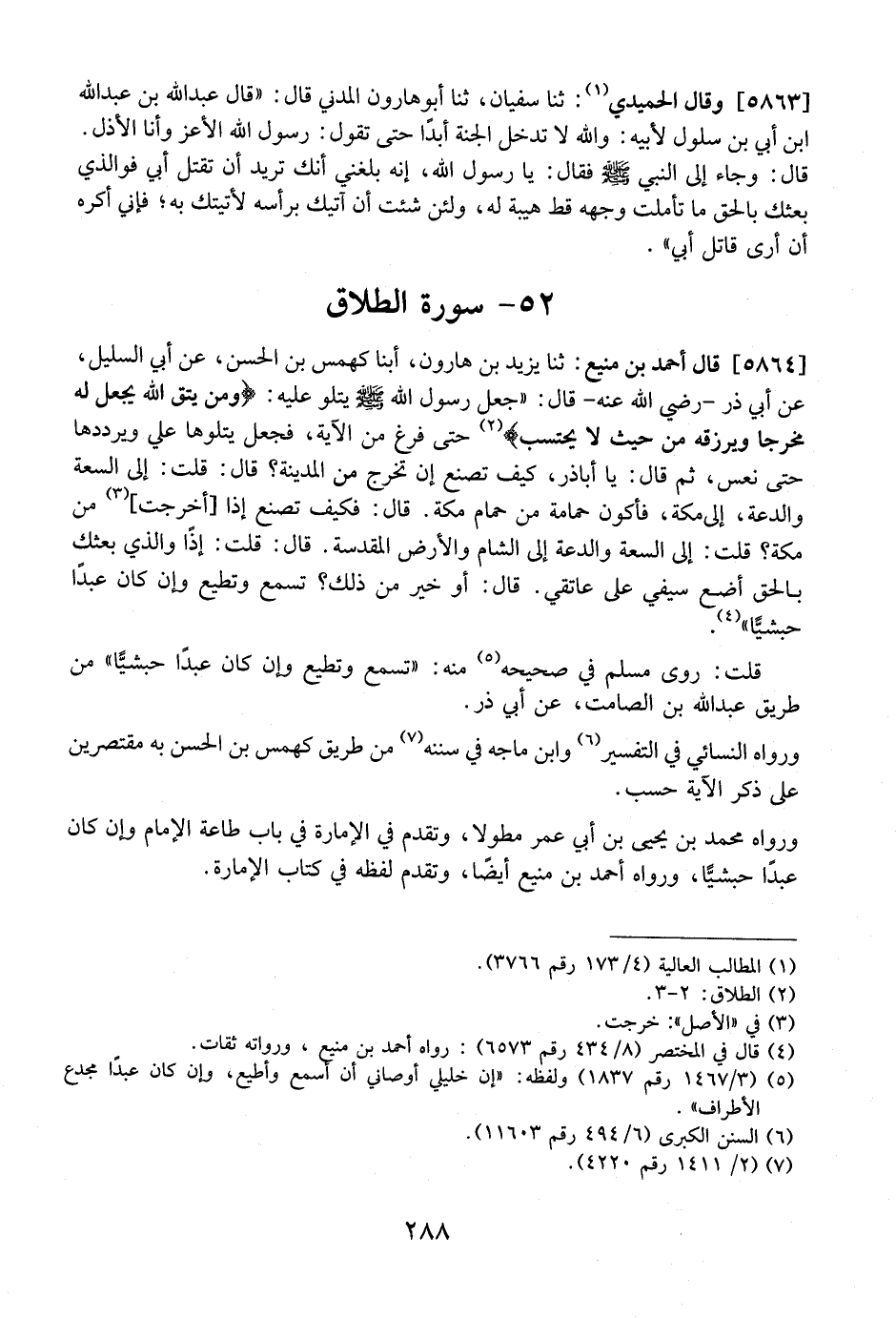 5864 - قَالَ أَحْمَدُ بْنُ مَنِيعٍ: ثَنَا يَزِيدُ بْنُ هَارُونَ، أبنا كَهْمَسُ بْنُ الْحَسَنِ، عَنْ أَبِي السَّلِيلِ، عَنْ أَبِي ذَرٍّ- رَضِيَ اللَّهُ عَنْهُ- قَالَ: "جَعَلَ رَسُولُ اللَّهِ - صَلَّى اللَّهُ عَلَيْهِ وَسَلَّمَ - يَتْلُو عَلَيْهِ: (وَمَنْ يَتَّقِ اللَّهَ يَجْعَلْ لَهُ مَخْرَجًا ويرزقه من حيث لا يحتسب) حَتَّى فَرَغَ مِنَ الْآيَةِ، فَجَعَلَ يَتْلُوهَا عَلَيَّ وَيُرَدِّدُهَا حَتَّى نَعَسَ، ثُمَّ قَالَ: يَا أَبَا ذَرٍّ، كَيْفَ تَصْنَعُ إِنْ تَخْرُجْ مِنَ الْمَدِينَةِ؟ قَالَ: قُلْتُ: إِلَى السَّعَةِ وَالدَّعَةِ، إِلَى مَكَّةَ، فَأَكُونُ حَمَامَةً مِنْ حَمَامِ مَكَّةَ. قَالَ: فَكَيْفَ تَصْنَعُ إِذَا أُخْرِجْتَ مِنْ مَكَّةَ؟ قُلْتُ: إِلَى السَّعَةِ وَالدَّعَةِ إِلَى الشَّامِ وَالْأَرْضِ الْمُقَدَّسَةِ. قَالَ: قُلْتُ: إِذًا وَالَّذِي بَعَثَكَ بِالْحَقِّ أَضَعُ سَيْفِي عَلَى عَاتِقِي. قَالَ: أَوَ خَيْرٌ مِنْ ذَلِكَ؟ تَسْمَعُ وَتُطِيعُ وَإِنْ كَانَ عَبْدًا حَبَشِيًّا".