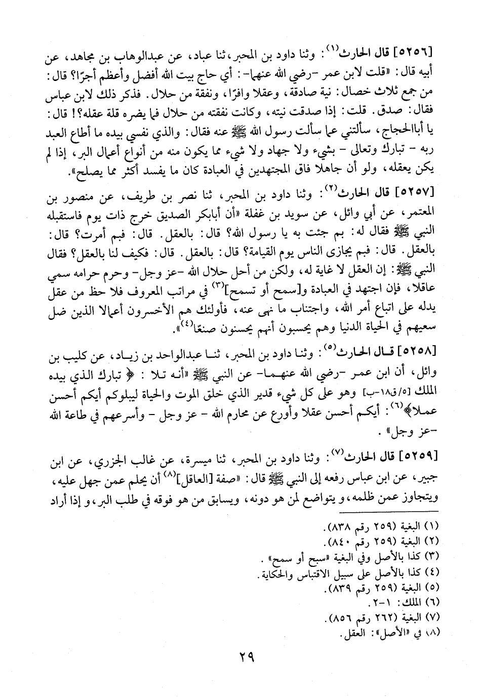5257 - قَالَ الْحَارِثُ: وَثَنَا دَاوُدُ بْنُ الْمُحَبَّرِ، ثَنَا نَصْرُ بن طريف، عن منصور بن المعتمر، عَنْ أَبِي وَائِلٍ، عَنْ سُوَيْدِ بْنِ غَفْلَةَ "أَنَّ أَبَا بَكْرٍ الصِّدِّيقَ خَرَجَ ذَاتَ يَوْمٍ فَاسْتَقْبَلَهُ النَّبِيِّ - صَلَّى اللَّهُ عَلَيْهِ وَسَلَّمَ - فَقَالَ لَهُ: بم جئت به يَا رَسُولَ اللَّهِ؟ قَالَ: بِالْعَقْلِ. قَالَ: فَبِمَ أَمَرْتَ؟ قَالَ: بِالْعَقْلِ. قَالَ: فَبِمَ يُجَازَى النَّاسَ يَوْمَ الْقِيَامَةِ؟ قَالَ: بِالْعَقْلِ. قَالَ: فَكَيْفَ لَنَا بِالْعَقْلِ؟ فَقَالَ النَّبِيُّ - صَلَّى اللَّهُ عَلَيْهِ وَسَلَّمَ -: إِنَّ الْعَقْلَ لَا غَايَةَ لَهُ، وَلَكِنْ مَنْ أَحَلَّ حَلَالَ اللَّهِ- عَزَّ وَجَلَّ- وَحَرَّمَ حَرَامَهُ سُمِّيَ عَاقِلًا، فَإِنِ اجْتَهَدَ فِي الْعِبَادَةِ وَسَمَحَ أَوْ تَسَمَّحَ، فِي مَرَاتِبِ الْمَعْرُوفِ فَلَا حَظَّ مِنْ عَقْلٍ يَدُلُّهُ عَلَى اتِّبَاعِ أَمْرِ اللَّهِ، وَاجْتِنَابِ مَا نَهَى عَنْهُ، فَأُولَئِكَ هُمُ الْأَخْسَرُونَ أَعْمَالًا الَّذِينَ ضَلَّ سَعْيُهُمْ فِي الْحَيَاةِ الدُّنْيَا وَهُمْ يَحْسَبُونَ أَنَّهُمْ يُحْسِنُونَ صُنْعًا".