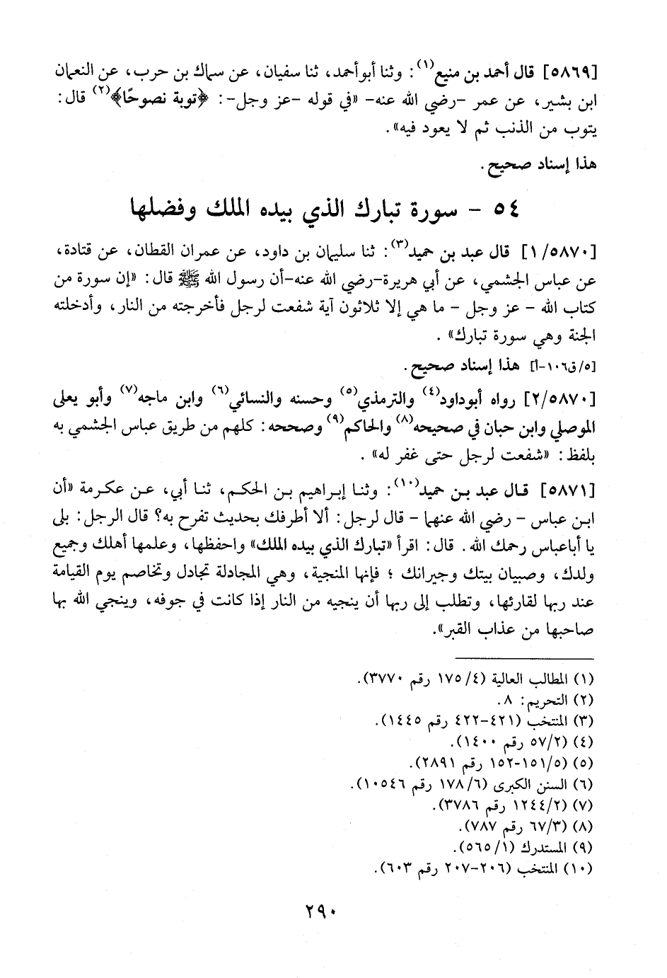 5870 / 1 - قال عَبْدُ بْنُ حُمَيْدٍ: ثَنَا سُلَيْمَانُ بْنُ دَاوُدَ، عن عمران القطان، عن قتادة، عن عباس الجشمي، عَنْ أَبِي هُرَيْرَةَ- رَضِيَ اللَّهُ عَنْهُ- أَنَّ رسول الله - صلى الله عليه وسلم - قال: "إِنَّ سُورَةً مِنْ كِتَابِ اللَّهِ- عَزَّ وَجَلَّ- مَا هِيَ إِلَّا ثَلَاثُونَ آيَةً شَفَعَتْ لِرَجُلٍ فَأَخْرَجَتْهُ مِنَ النَّارِ، وَأَدْخَلَتْهُ الْجَنَّةَ وَهِيَ سُورَةُ تبارك".