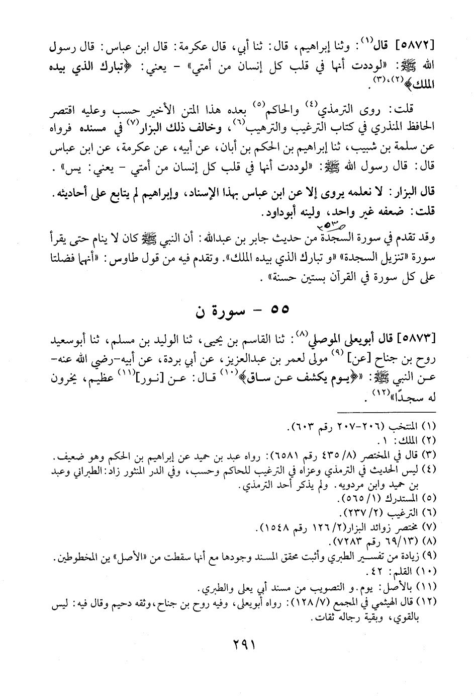 قُلْتُ: رَوَى التِّرْمِذِيُّ وَالْحَاكِمُ بعده هذا الْمَتْنَ الْأَخِيرَ حَسْبُ وَعَلَيْهِ اقْتَصَرَ الْحَافِظُ الْمُنْذِرِيُّ في كتاب الترغيب والترهيب، وخالف ذَلِكَ الْبَزَّارُ فِي مُسْنَدِهِ فَرَوَاهُ عَنْ سَلَمَةَ بن شبيب، ثنا إِبْرَاهِيمَ بْنِ الْحَكَمِ بْنِ أَبَانٍ، عَنْ أَبِيهِ، عَنْ عِكْرِمَةَ، عَنِ ابْنِ عَبَّاسٍ قَالَ: قَالَ رَسُولُ اللَّهِ - صَلَّى اللَّهُ عَلَيْهِ وَسَلَّمَ -: (لَوَدِدْتُ أَنَّهَا فِي قَلْبِ كُلِّ إِنْسَانٍ مِنْ أُمَّتِي- يعني: يس". قال البزار: لا نعلمه يروى إلا عن ابن عباس بهذا الإسناد، وإبراهيم لم يتابع على أحاديثه. قلت: ضعفه غير واحد، ولينه أبو داود.