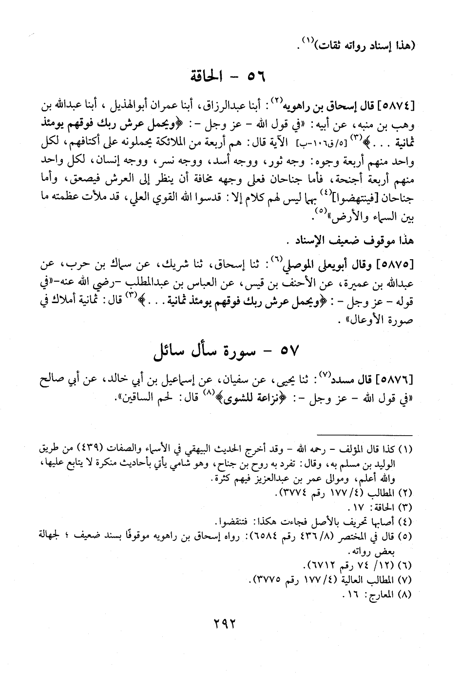 5874 - قال إسحاق بن راهويه: أبنا عبد الرزاق، أبنا عمران أبو الهذيل، أبنا عَبْدُ اللَّهِ بْنُ وَهْبِ بْنِ مُنَبِّهٍ، عَنْ أبيه: "في قول الله- عَزَّ وَجَلَّ-: (وَيَحْمِلُ عَرْشَ رَبِّكَ فَوْقَهُمْ يَوْمَئِذٍ ثمانية ... ) الْآيَةَ قَالَ: هُمْ أَرْبَعَةٌ مِنَ الْمَلَائِكَةِ يَحْمِلُونَهُ عَلَى أَكْتَافِهِمْ، لِكُلِّ وَاحِدٍ مِنْهُمْ أَرْبَعَةُ وُجُوهٍ: وَجْهُ ثَوْرٍ، وَوَجْهُ أَسَدٍ، وَوَجْهُ نِسْرٍ، وَوَجْهُ إِنْسَانٍ، لِكُلِّ وَاحِدٍ مِنْهُمْ أَرْبَعَةُ أَجْنِحَةٍ، فَأَمَّا جَنَاحَانِ فَعَلَى وَجْهِهِ مَخَافَةَ أَنْ يَنْظُرَ إِلَى العرش فيصعق، وأما جناحان فينتهضوا بِهِمَا لَيْسَ لَهُمْ كَلَامٌ إِلَّا: قَدِّسُوا اللَّهَ الْقَوِيَّ الْعَلِيَّ، قَدْ مَلَأَتْ عَظَمَتُهُ مَا بَيْنَ السَّمَاءِ وَالْأَرْضِ".
