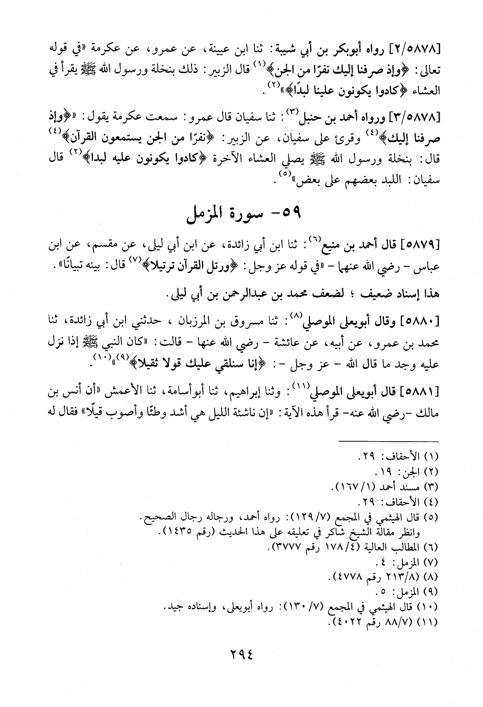 5878 / 2 - رَوَاهُ أَبُو بَكْرِ بْنُ أَبِي شَيْبَةَ: ثنا بن عُيَيْنَةَ، عَنْ عَمْرٍو، عَنْ عِكْرِمَةَ "فِي قَوْلِهِ تَعَالَى: (وَإِذْ صَرَفْنَا إِلَيْكَ نَفَرًا مِنَ الْجِنِّ) قَالَ الزُّبَيْرُ: ذَلِكَ بِنَخْلَةَ وَرَسُولُ اللَّهِ - صَلَّى اللَّهُ عَلَيْهِ وَسَلَّمَ - يَقْرَأُ فِي الْعِشَاءِ (كَادُوا يكونون علينا لبداً) ".