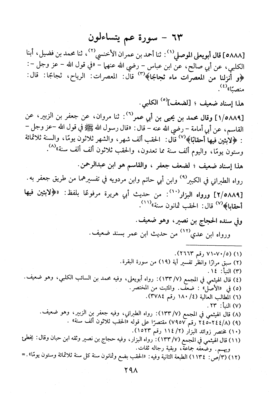 5889 / 1 - وَقَالَ مُحَمَّدُ بْنُ يَحْيَى بْنِ أَبِي عُمَرَ: ثَنَا مَرْوَانُ، عَنْ جَعْفَرُ بْنُ الزُّبَيْرِ، عَنِ الْقَاسِمِ، عَنْ أَبِي أُمَامَةَ- رَضِيَ اللَّهُ عَنْهُ- قَالَ: "قَالَ رَسُولُ اللَّهِ - صَلَّى اللَّهُ عَلَيْهِ وَسَلَّمَ - فِي قَوْلِ اللَّهِ- عز وجل-: (لابثين فيها أحقاباً) قَالَ: الْحُقْبُ أَلْفُ شَهْرٍ، وَالشَّهْرُ ثَلَاثُونَ يَوْمًا، والسنة ثلاثمائة وَسِتُّونَ يَوْمًا، وَالْيَوْمُ أَلْفُ سَنَةٍ مِمَّا تَعُدُّونَ، والحقب ثلاثون ألف ألف سنة".