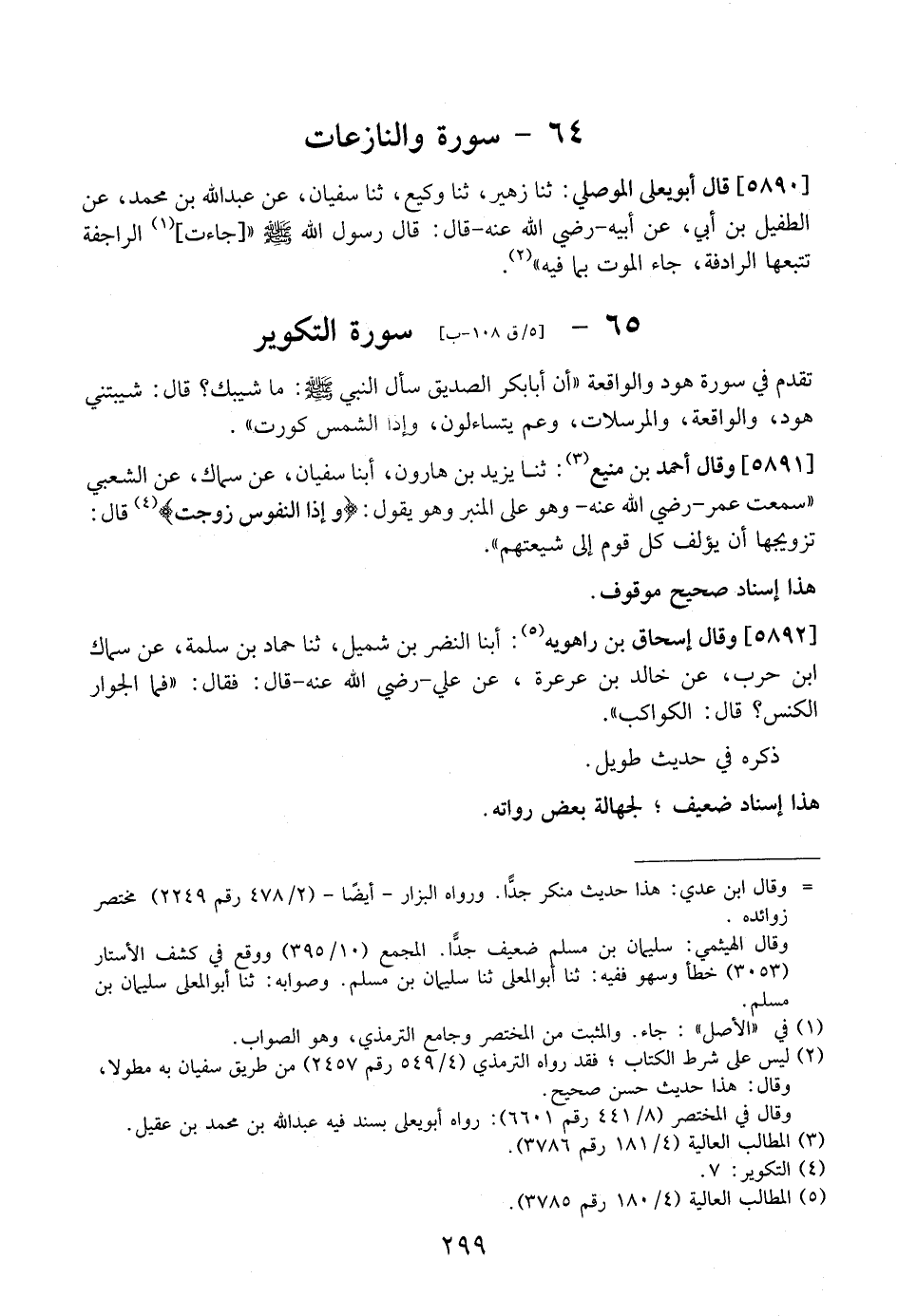 5892 - وَقَالَ إِسْحَاقُ بن راهويه: أبنا النَّضْرُ بْنُ شُمَيْلٍ، ثَنَا حَمَّادُ بْنُ سَلَمَةَ، عَنْ سِمَاكِ بْنِ حَرْبٍ، عَنْ خَالِدِ بْنِ عَرْعَرَةَ، عَنْ عَلِيٍّ- رَضِيَ اللَّهُ عَنْهُ- قَالَ: فَقَالَ: "فَمَا الْجَوَارِ الْكُنَّسِ؟ قَالَ: الْكَوَاكِبُ".