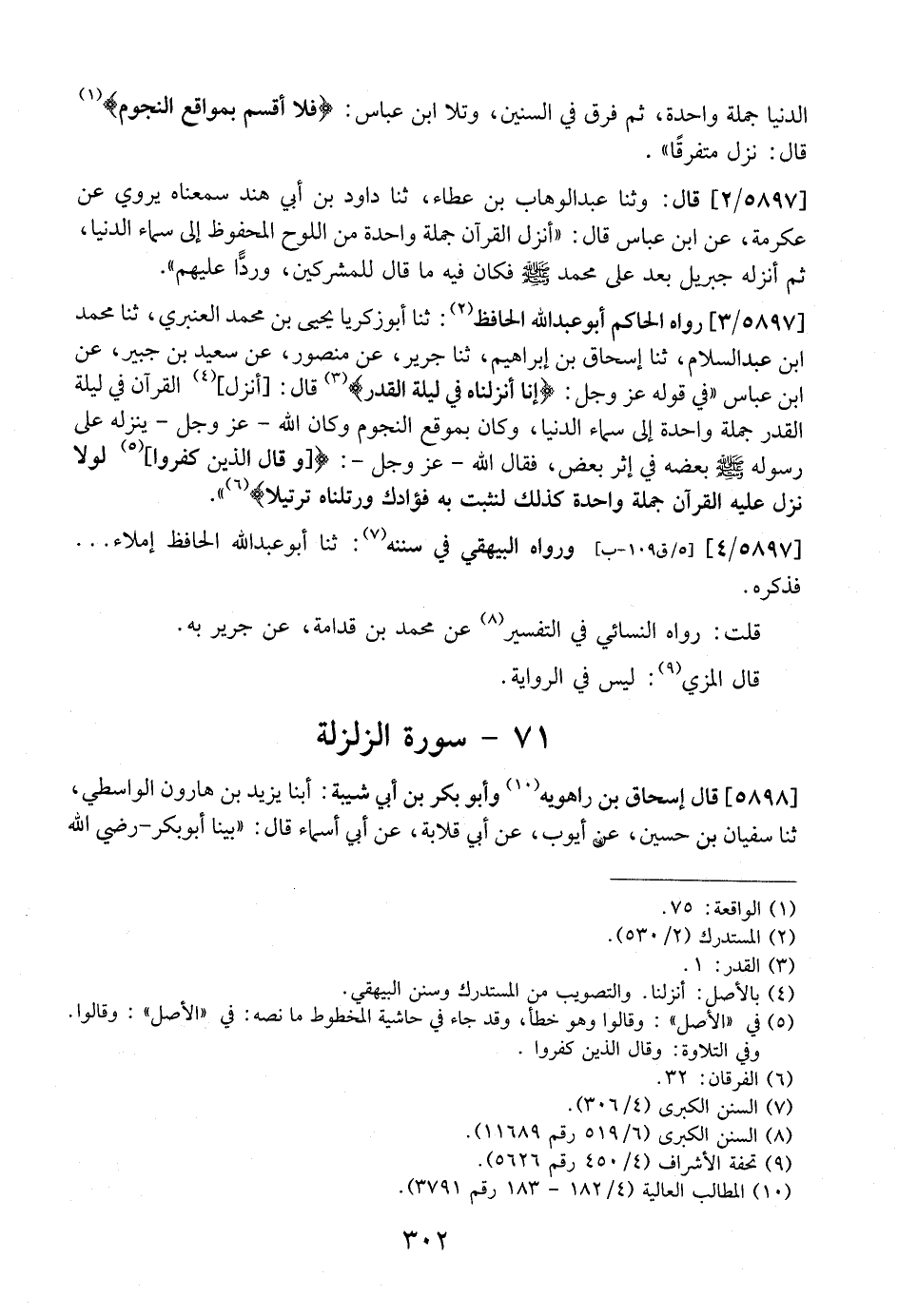 5897 / 3 - رَوَاهُ الْحَاكِمُ أَبُو عَبْدِ اللَّهِ الْحَافِظُ: ثَنَا أَبُو زَكَرِيَّا يَحْيَى بْنُ مُحَمَّدٍ الْعَنْبَرِيُّ ثَنَا مُحَمَّدُ بْنُ عَبْدِ السَّلَامِ، ثَنَا إِسْحَاقُ بْنُ إِبْرَاهِيمَ، ثَنَا جَرِيرٌ، عَنْ مَنْصُورٍ، عَنْ سَعِيدِ بْنِ جُبَيْرٍ، عَنِ ابْنِ عَبَّاسٍ "فِي قَوْلِهِ عَزَّ وَجَلَّ: (إِنَّا أَنْزَلْنَاهُ فِي لَيْلَةِ الْقَدْرِ) قال: أنزل الْقُرْآنَ فِي لَيْلَةِ الْقَدْرِ جُمْلَةً وَاحِدَةً إِلَى سَمَاءِ الدُّنْيَا، وَكَانَ بِمَوْقِعِ النُّجُومِ وَكَانَ اللَّهُ- عز وجل- ينزله على رسول - صَلَّى اللَّهُ عَلَيْهِ وَسَلَّمَ - بَعْضُهُ فِي إِثْرِ بَعْضٍ، فَقَالَ اللَّهُ- عَزَّ وَجَلَّ-: (وَقَالَ الَّذِينَ كفروا لولا نزل عليه القرآن جُمْلَةً وَاحِدَةً كَذَلِكَ لِنُثَبِّتَ بِهِ فُؤَادَكَ وَرَتَّلْنَاهُ ترتيلاً) ".