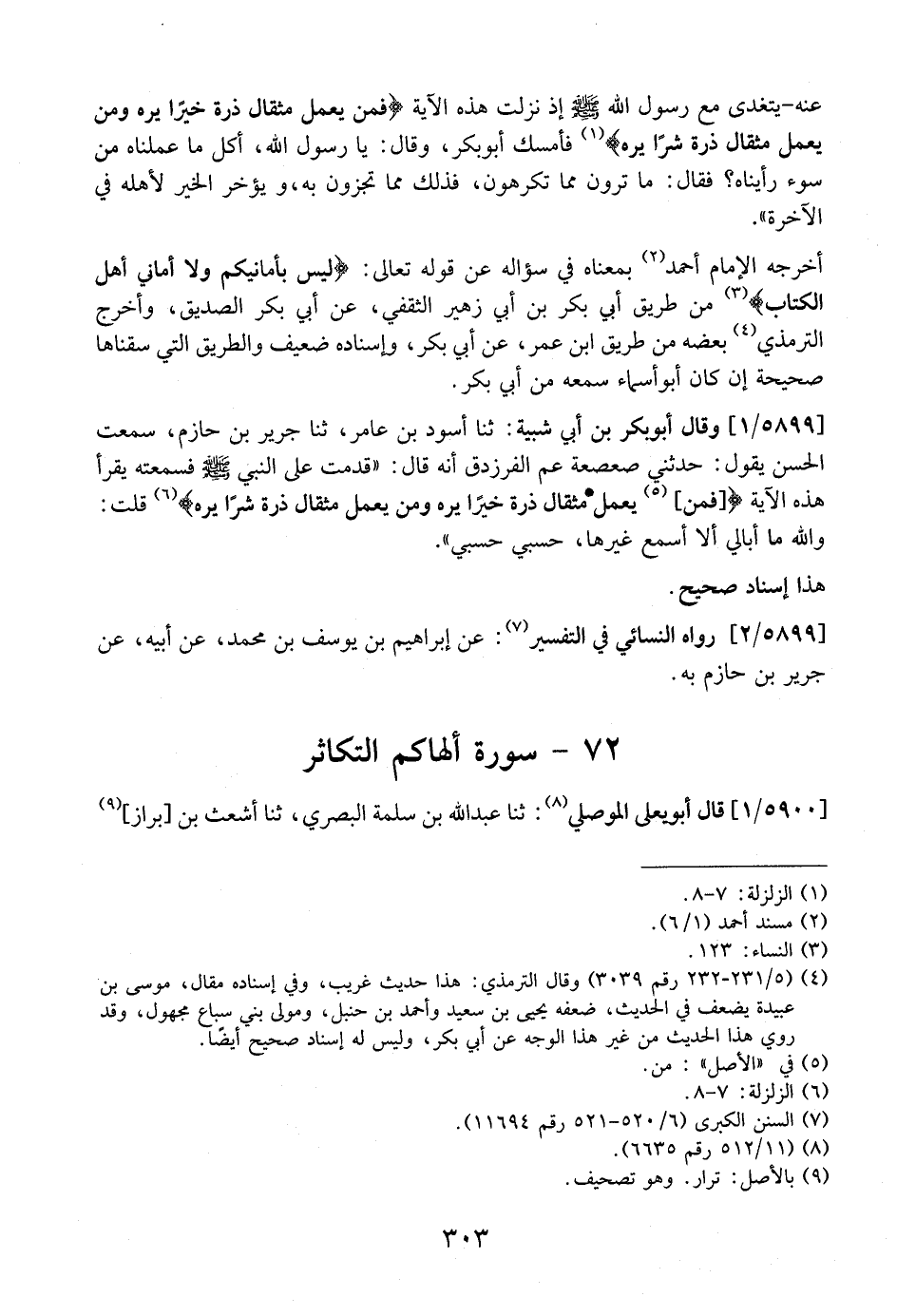 5899 / 1 - وَقَالَ أَبُو بَكْرِ بْنُ أَبِي شَيْبَةَ: ثَنَا أَسْوَدُ بْنُ عَامِرٍ، ثَنَا جَرِيرُ بْنُ حَازِمٍ، سمعت الحسن يَقُولُ: حَدَّثَنِي صَعْصَعَةُ عَمُّ الْفَرَزْدَقِ أَنَّهُ قَالَ: "قَدِمْتُ عَلَى النَّبِيِّ - صَلَّى اللَّهُ عَلَيْهِ وَسَلَّمَ - فَسَمِعْتُهُ يَقْرَأُ هَذِهِ الْآيَةَ (فَمَنْ، يَعْمَلْ مِثْقَالَ ذرة خيرا يره ومن يعمل مثقال ذرة شراً يره) قُلْتُ: وَاللَّهِ مَا أُبَالِي أَلَّا أَسْمَعَ غَيْرَهَا، حَسْبِي حَسْبِي".