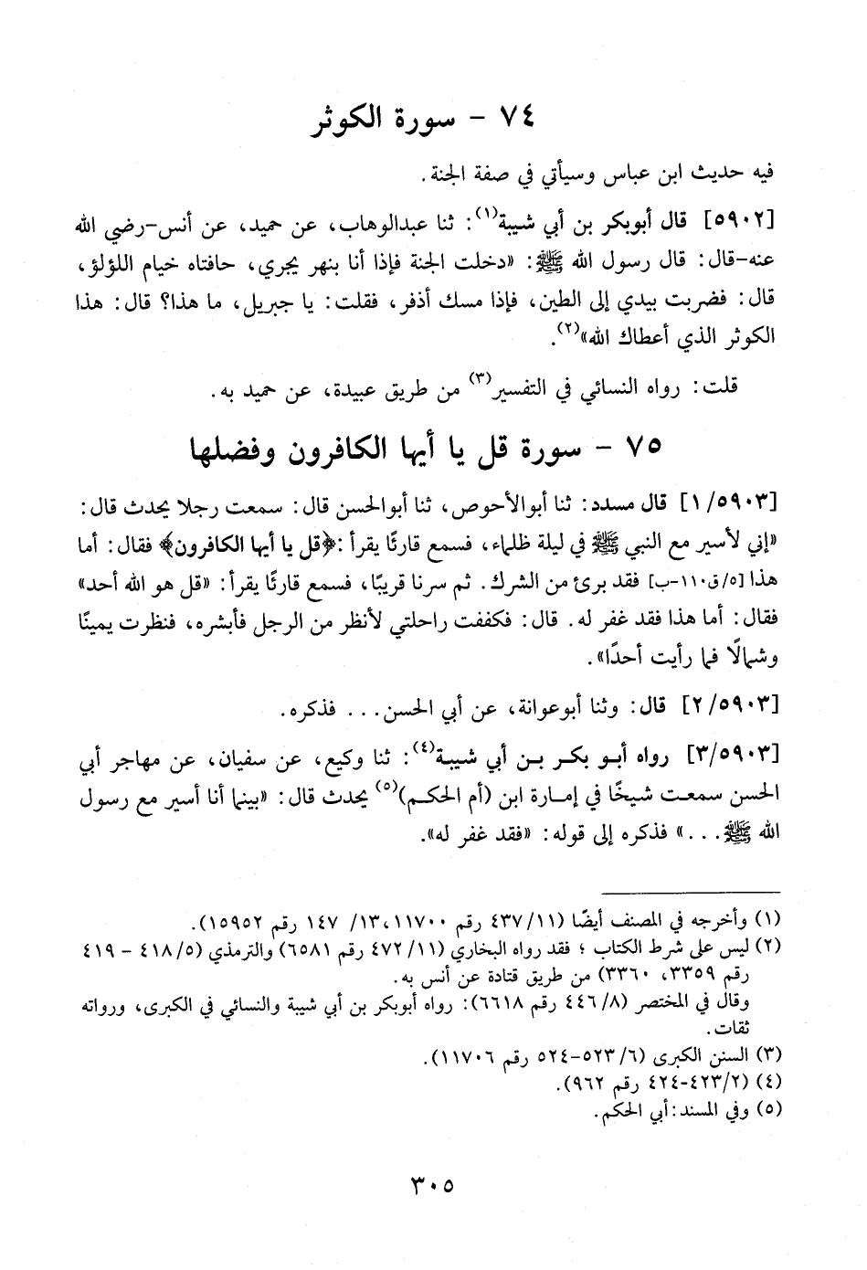 5903 / 1 - قَالَ مُسَدَّدٌ: ثَنَا أَبُو الْأَحْوَصِ، ثَنَا أَبُو الْحَسَنِ قَالَ: سَمِعْتُ رَجُلًا يُحَدِّثُ قَالَ: "إِنِّي لَأَسِيرُ مَعَ النَّبِيِّ - صَلَّى اللَّهُ عَلَيْهِ وَسَلَّمَ - فِي لَيْلَةٍ ظَلْمَاءَ، فَسَمِعَ قارئاً يقرأ: (قل يا أيها الْكَافِرُونَ) فَقَالَ: أَمَّا هَذَا فَقَدْ بَرِئَ مِنَ الشِّرْكِ. ثُمَّ سِرْنَا قَرِيبًا، فَسَمِعَ قَارِئًا يَقْرَأُ: "قُلْ هُوَ اللَّهُ أَحَدٌ" فَقَالَ: أَمَّا هَذَا فَقَدْ غُفِرَ لَهُ. قَالَ: فَكَفَفْتُ رَاحِلَتِي لِأَنْظُرَ مَنِ الرَّجُلُ فَأُبَشِّرُهُ، فَنَظَرْتُ يَمِينًا وَشِمَالًا فَمَا رَأَيْتُ أَحَدًا".